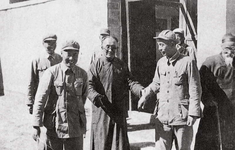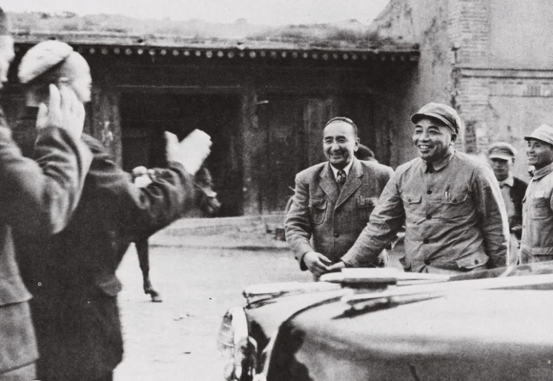 图7:1949年9月,宁夏解放,中国人民解放军19兵团司令杨得志(前左一)、政委李志民(前右二)与国民党西北军政副长官马鸿宾(前左二)会晤