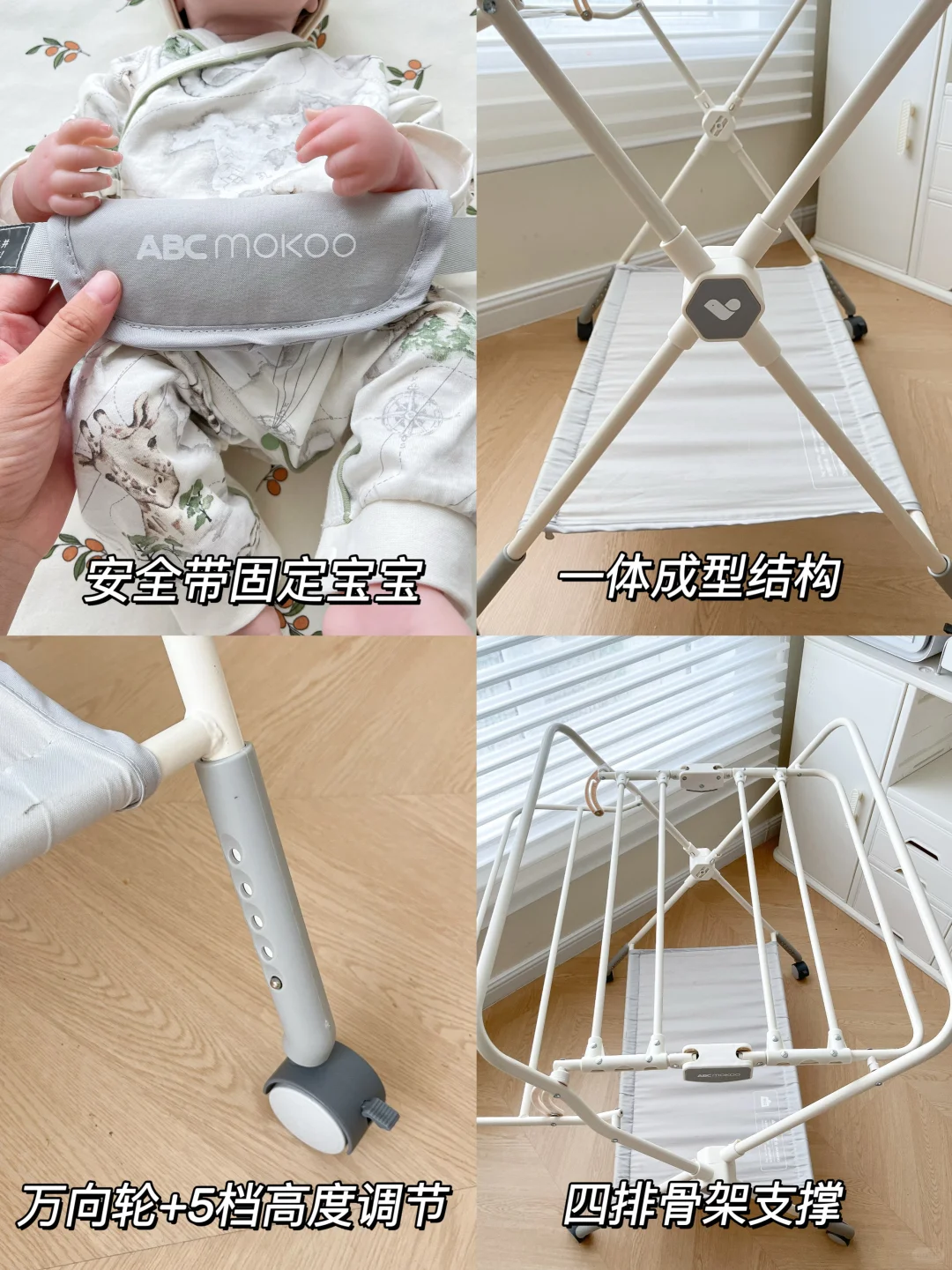万向轮可以随处移动,推到阳台,给宝宝晒太阳,晾PP,还能推行哄睡,一边做家务一边看娃不耽误