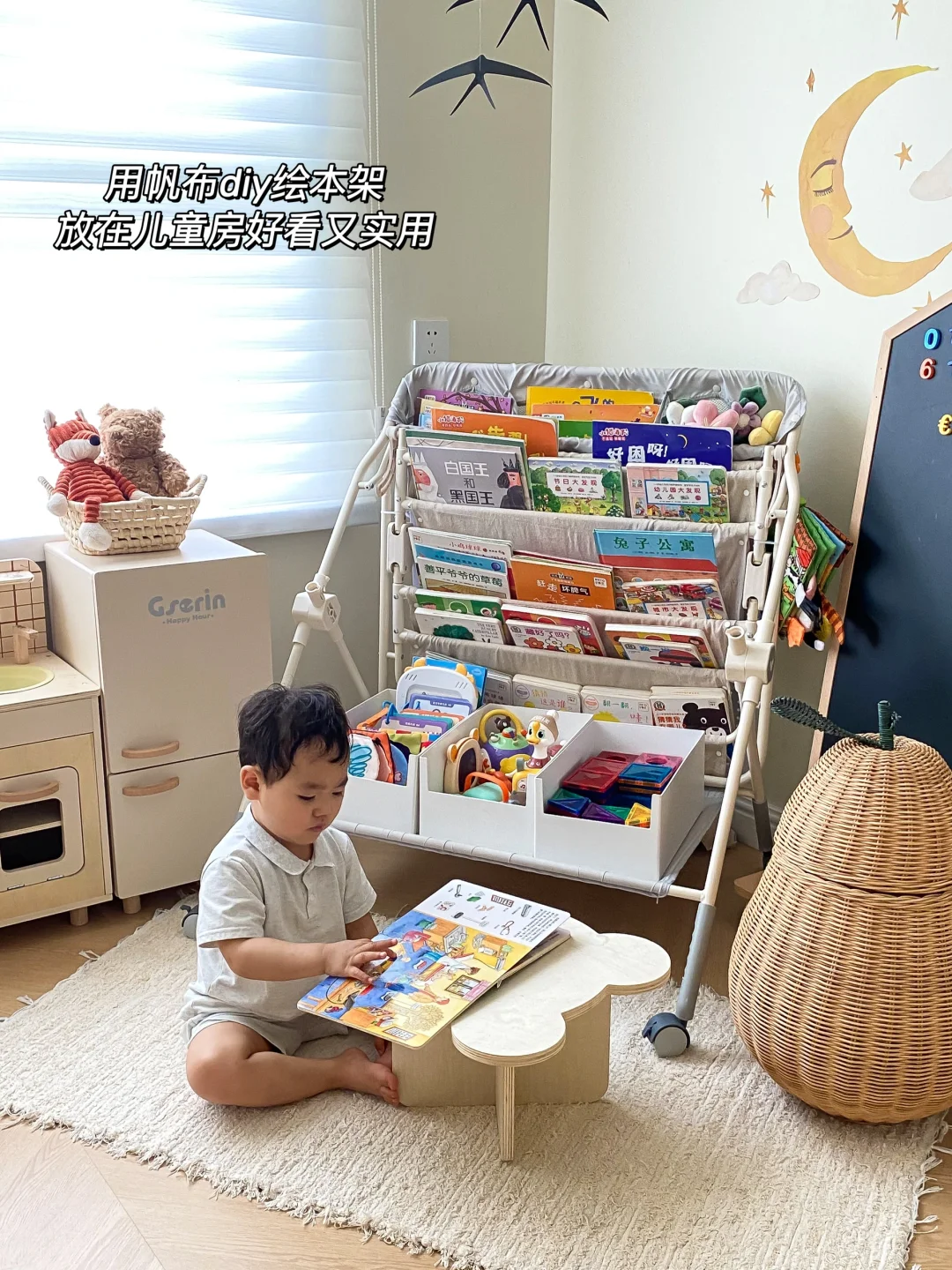 一面拆开用帆布diy就变成绘本架了,上边放绘本,下边放上收纳盒还可以放玩具,放在儿童房好看又实用