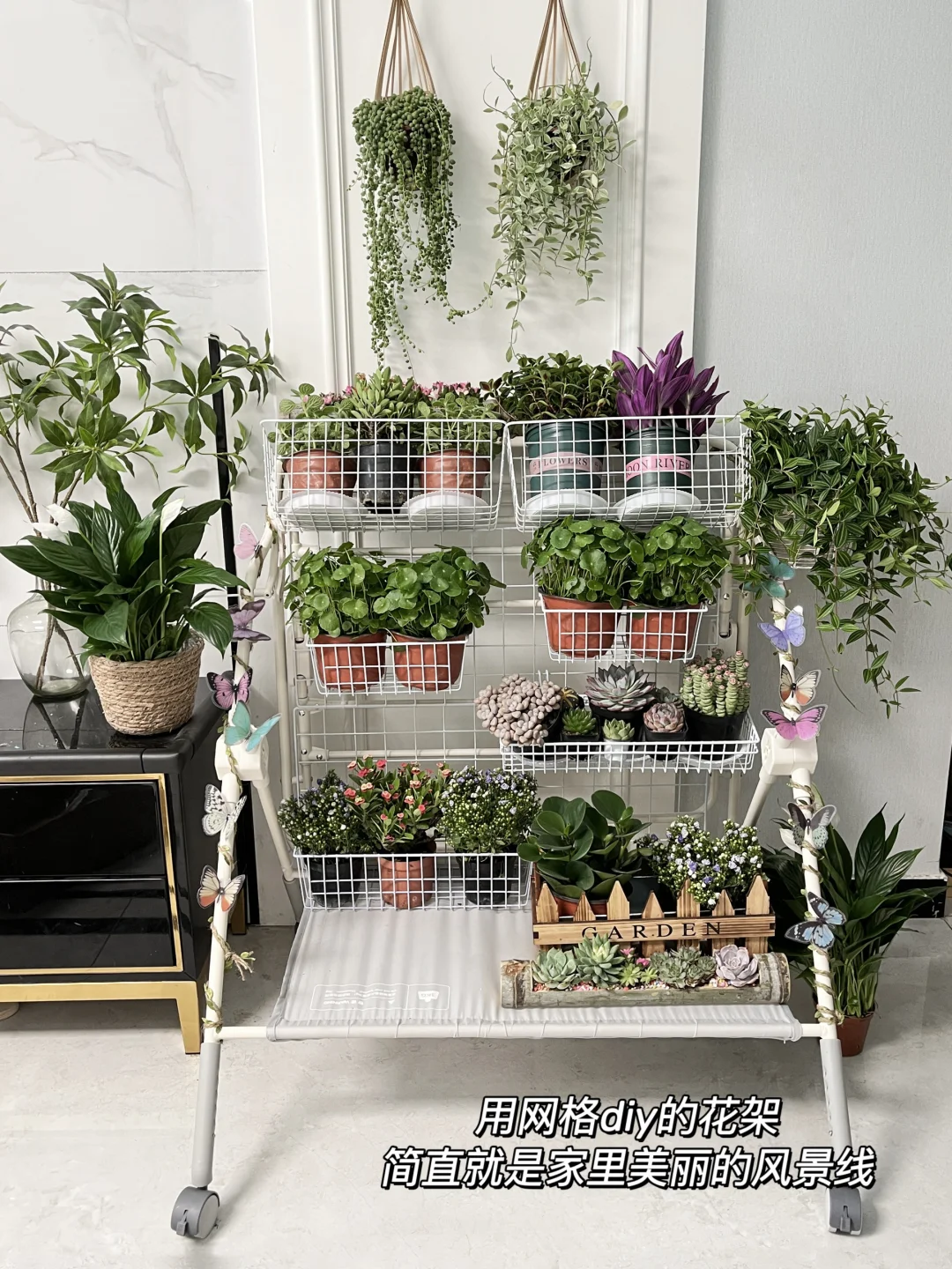 用网格diy一下,就是敲好看的花架,还能推行,放在客厅阳台都行,简直就是家里美丽的风景线