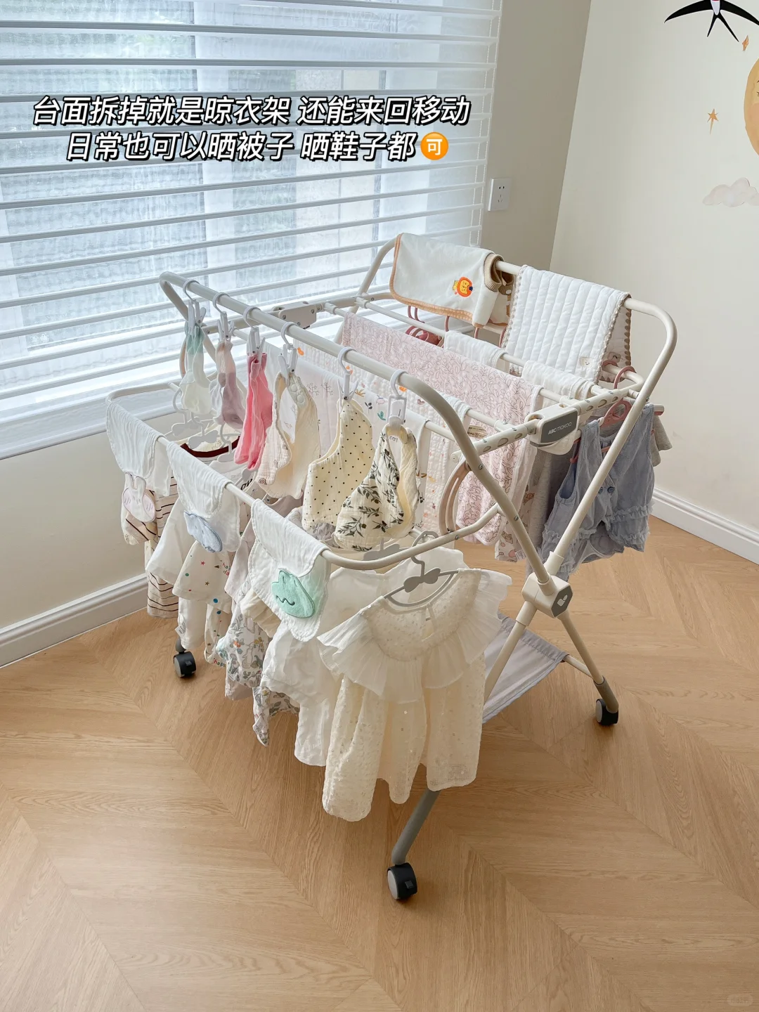 放在阳台晾宝宝衣服敲方便,还能来回移动,日常也可以晒被子,晒鞋子都🉑️不用了还可以折叠收起来