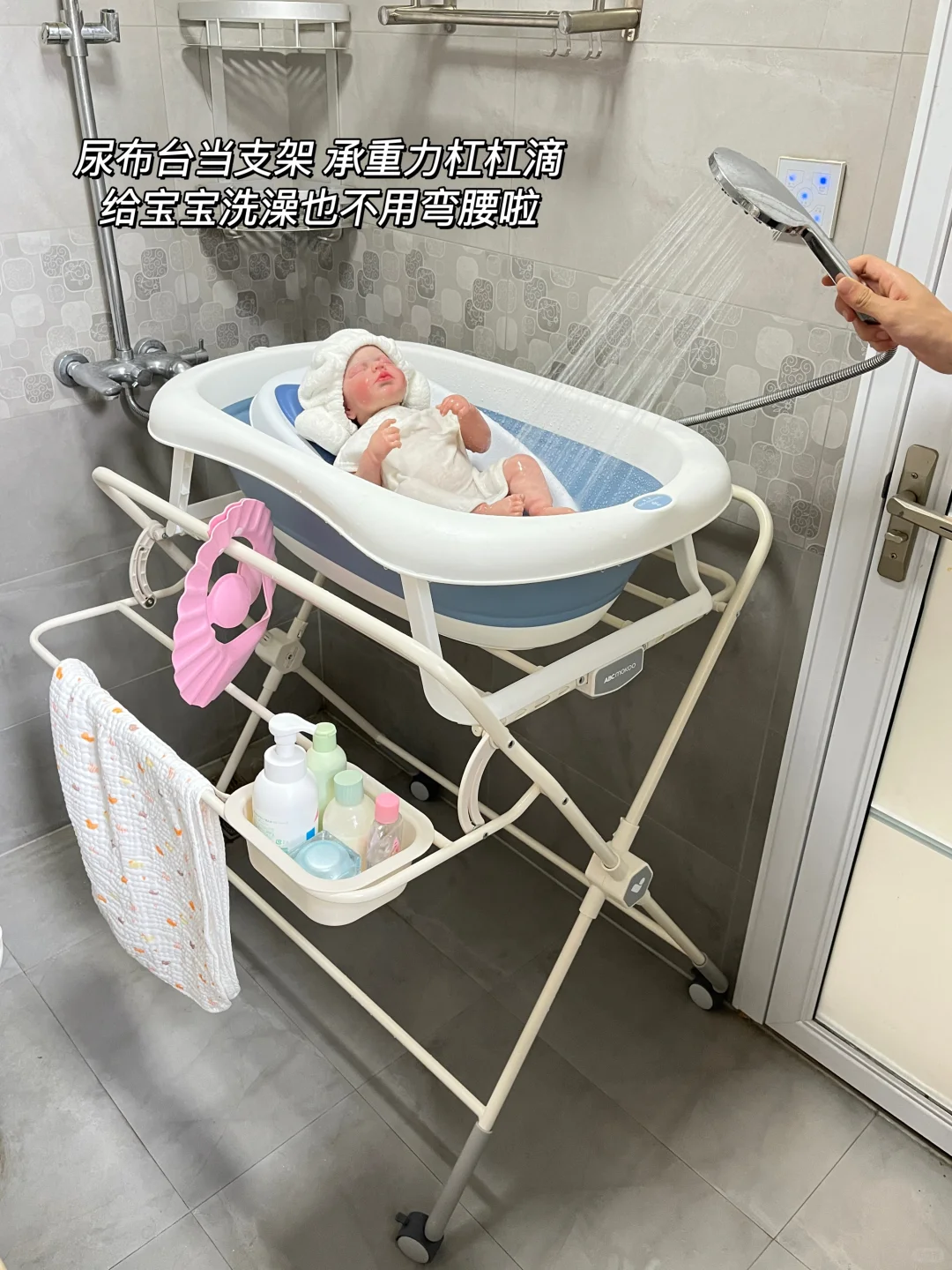 浴盆放上去尿布台当一个支架,承重力杠杠滴,很稳固,给宝宝洗澡也不用弯腰啦