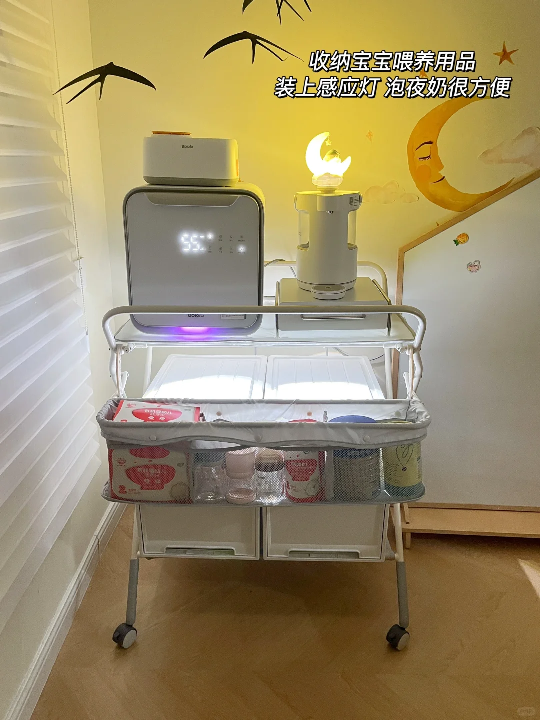 台面放上消毒柜,侧面收纳宝宝喂养用品,底部用抽屉收纳盒收纳宝宝日常用品,装上感应灯,泡夜奶很方便