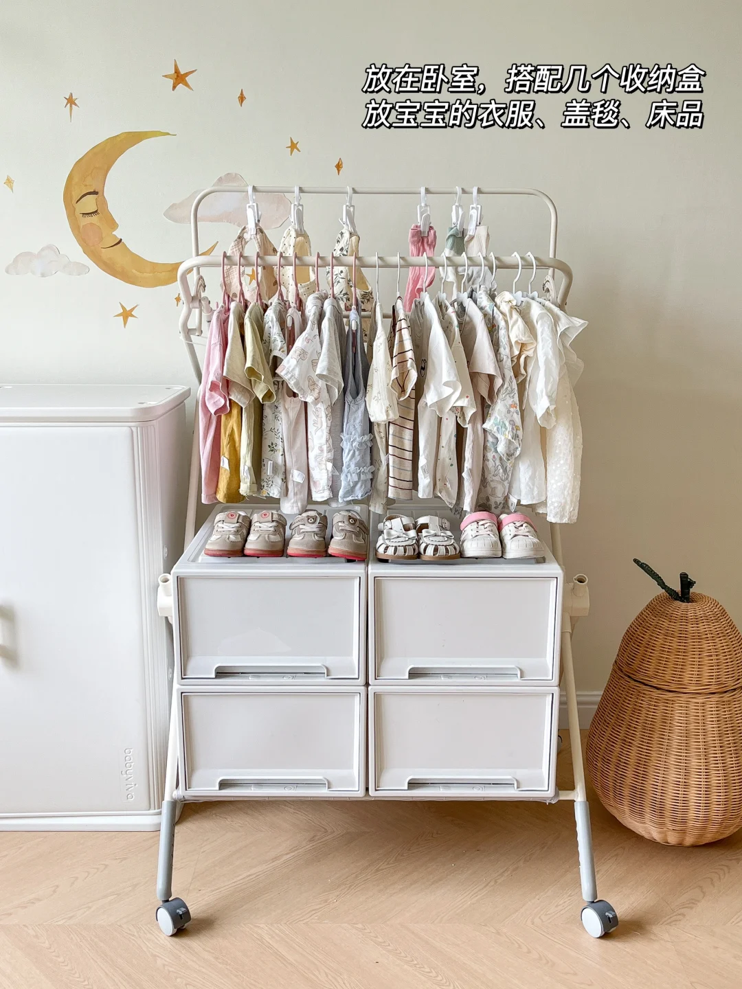 改造成小衣架放在卧室,搭配几个收纳盒,放宝宝的衣服、盖毯,床品,敲适合小户型