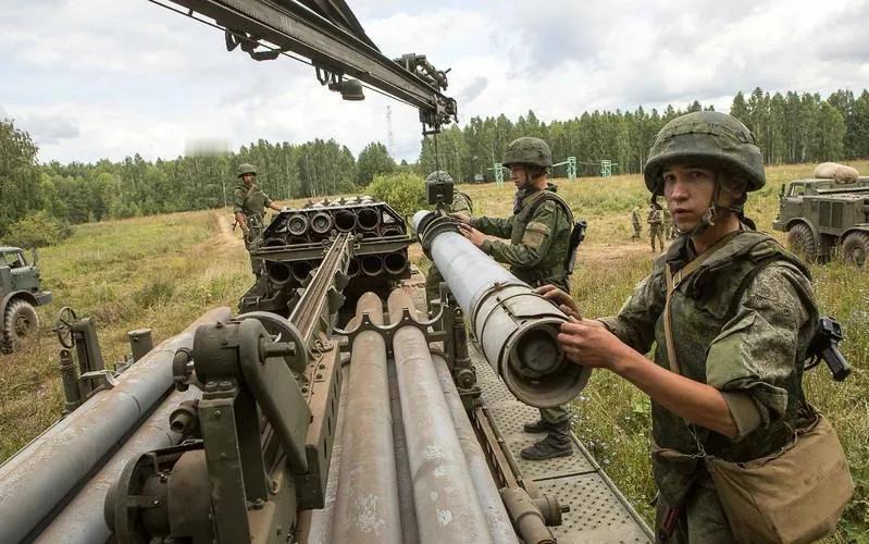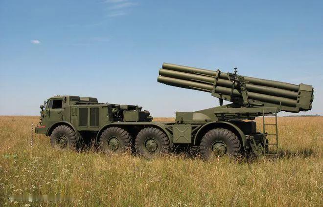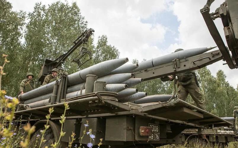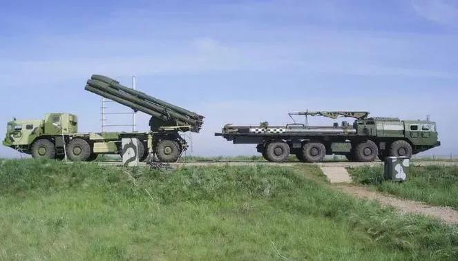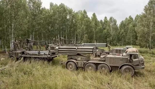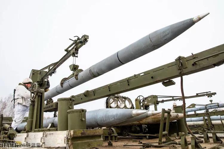 俄军的BM-27“飓风”16管220毫米火箭炮,装填系统比较笨重落后。 需要先将运输装填车上的火箭弹吊装到导轨上,然后通过导轨将火箭弹推入发射车的定向管。整个火箭弹装填过程,需要多人密切配合才能完成。 这套装填系统的机械结构和动作很复杂,缺点非常多,装填时间长达15~20分钟。