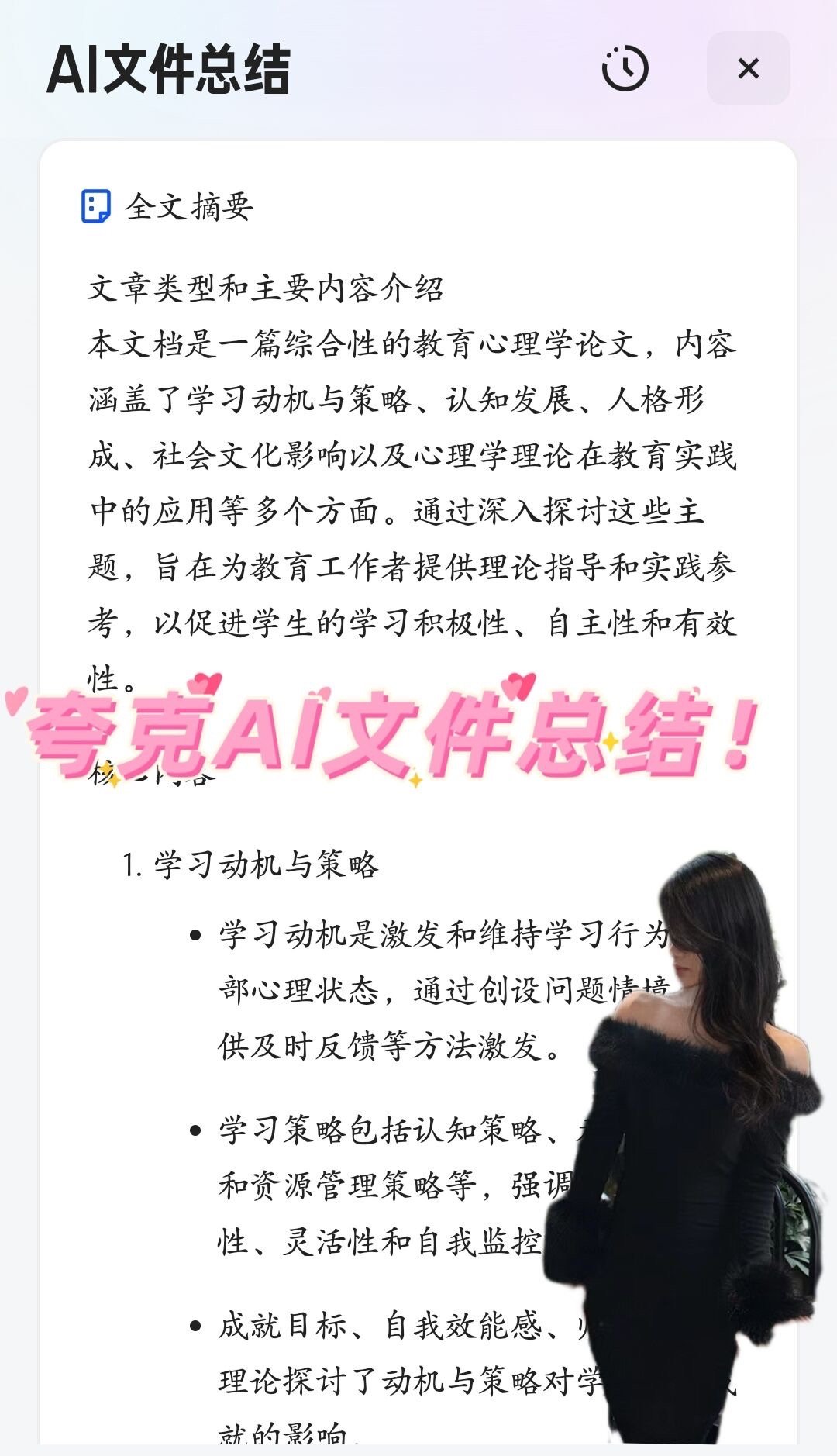 🔍🔍🔍AI视频文件总结。这个功能简直帮了小美大忙啦!在学习教编的过程中,小美的网课一节便是一个多小时!可把小美折磨坏了,还有超多的知识点。还好有夸克AI视频文件总结,帮助小美快速总结课程,汇总知识点,快速了解学习内容,提高学习效率!