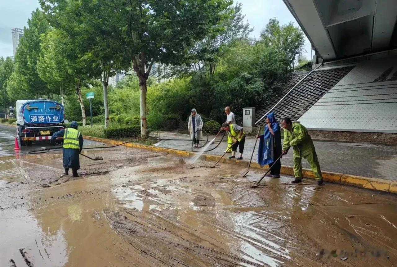 昨天强降雨造成上阳路、春秋路、上阳南路、召公路、虢国东路、大岭南路高速桥下、北环西路等10余处主要点位淤泥污染严重,共出动环卫人员1900余人,车辆120台次,清运淤泥150余吨,志愿者50余人,清理冲洗污染道路区域60多万平方米,保证了主城区干净整洁通行顺畅。 昨天下午2点50左右,道路保洁人员已开始沿路巡查,对一些排水不畅的井篦实施清理作业,设置简易冒溢污水井警示。随着雨情的进一步扩大,一些重点部位淤泥泥水流入城区,环卫部门一方面组织人员先行引流污水流向减少污染范围,另一方面组织人员机械清淤除污,淤泥装车运走,污水清扫入井,利用高压冲洗车冲洗清过后道路,尽力避免污染进一步扩大。垃圾场加强巡回巡检,冒雨组织人员坚守排水关键位置。 傍晚时分,降雨暂停,劳累了近5个小时的环卫工人顾不上休息,立即加入了人机结合大冲洗作业中,集中力量冲洗道路,清扫道路砂石,冲洗交通十字路口,清运绿化抢险余下树枝,清理雨篦杂物垃圾,清除人行道掉落树枝杂物,转运雨后道路垃圾。 就是这样辛勤劳动的人们,年龄还都那么大了。我们城市居然还出现过拖欠他们工资的情况。希望政府能按时给他们发工资。