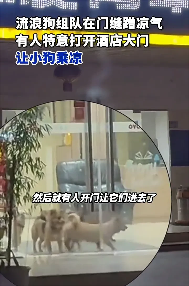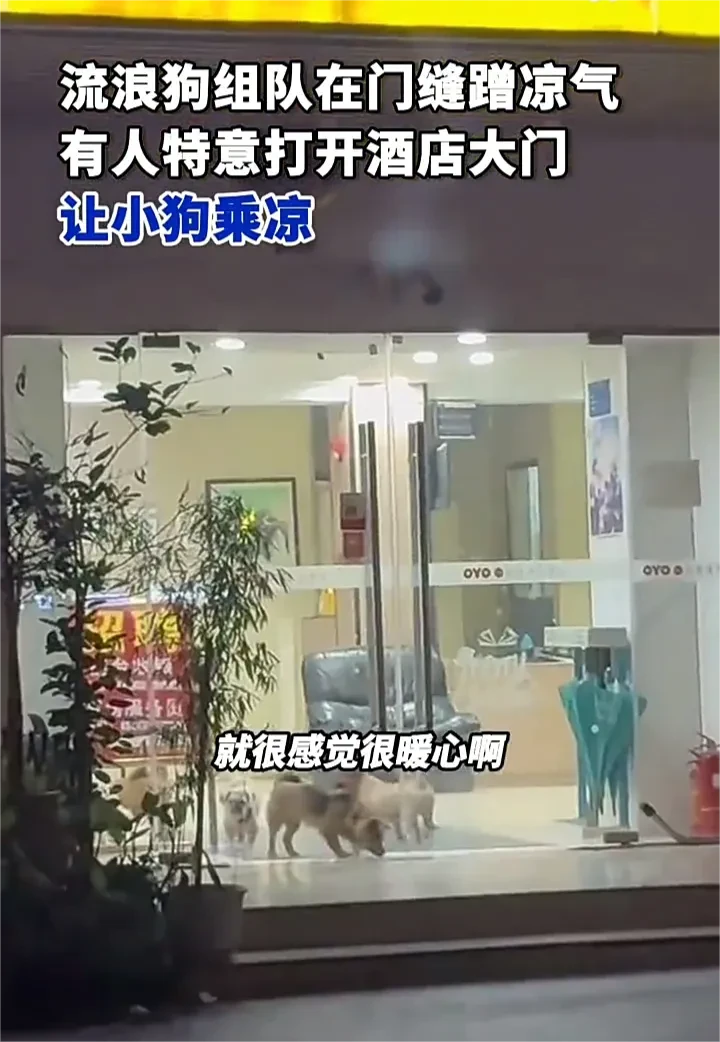 7月22日,湖北武汉一名男子发视频称,自己路过一酒店时,看到几只小狗趴在门缝蹭空调,过了一会,酒店工作人员开门让几只小狗进到大厅内乘凉,看到这一幕,男子觉得非常暖心。网友:“善良不分大小,好样的。”