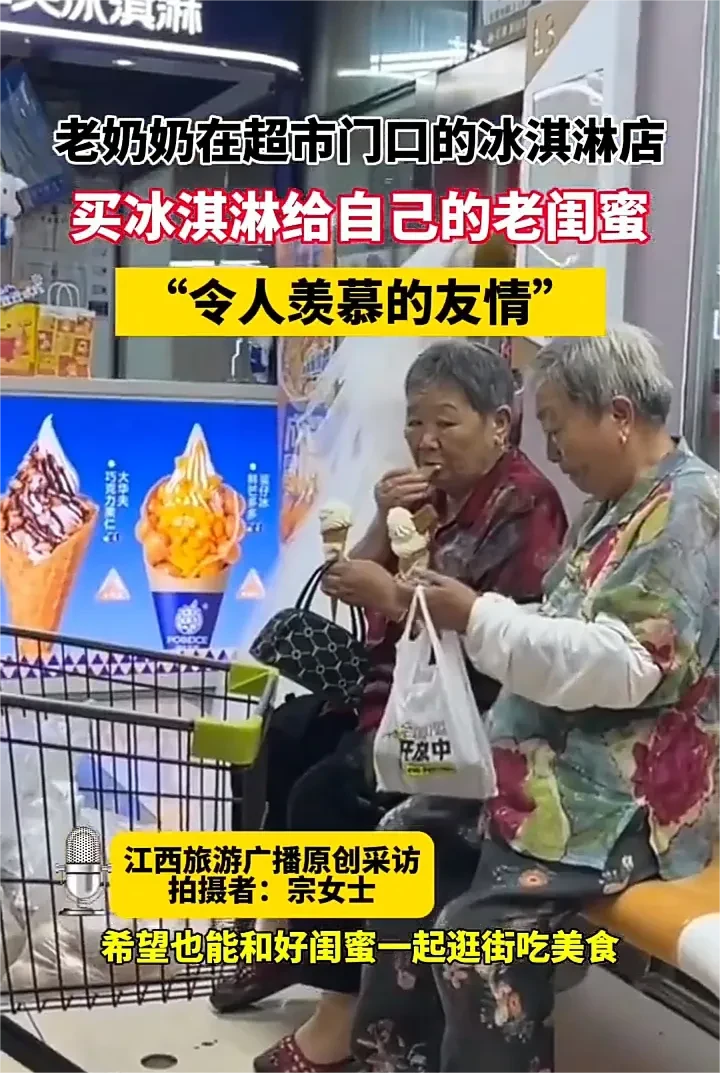 这是一件看完令人觉得很温馨的事件!这两位奶奶在这个年纪还能一起逛街,一起吃冰淇淋,可见她们的友情非常得好。能够找到志同道合的伙伴,真的是人生一大幸事,这样的友情令人感动,也令人羡慕。大家怎么看呢?