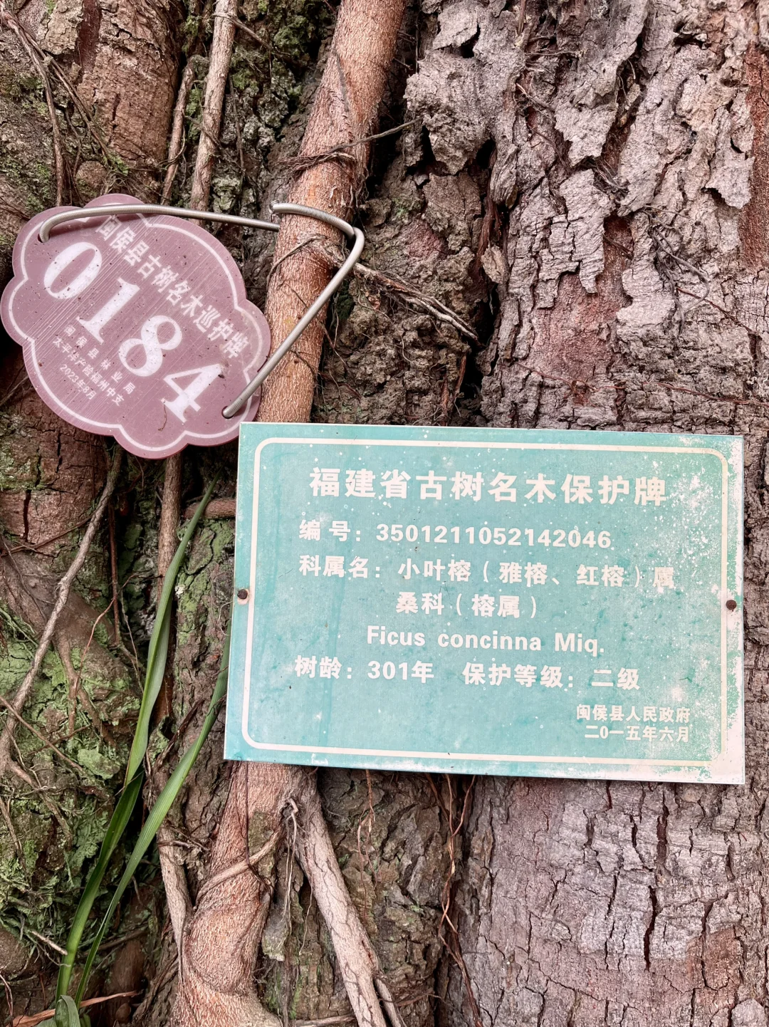 该小叶榕的身份证号是350121105242046,巡护编号为闽侯县古树名木巡护牌0184号,是一棵二级古树。