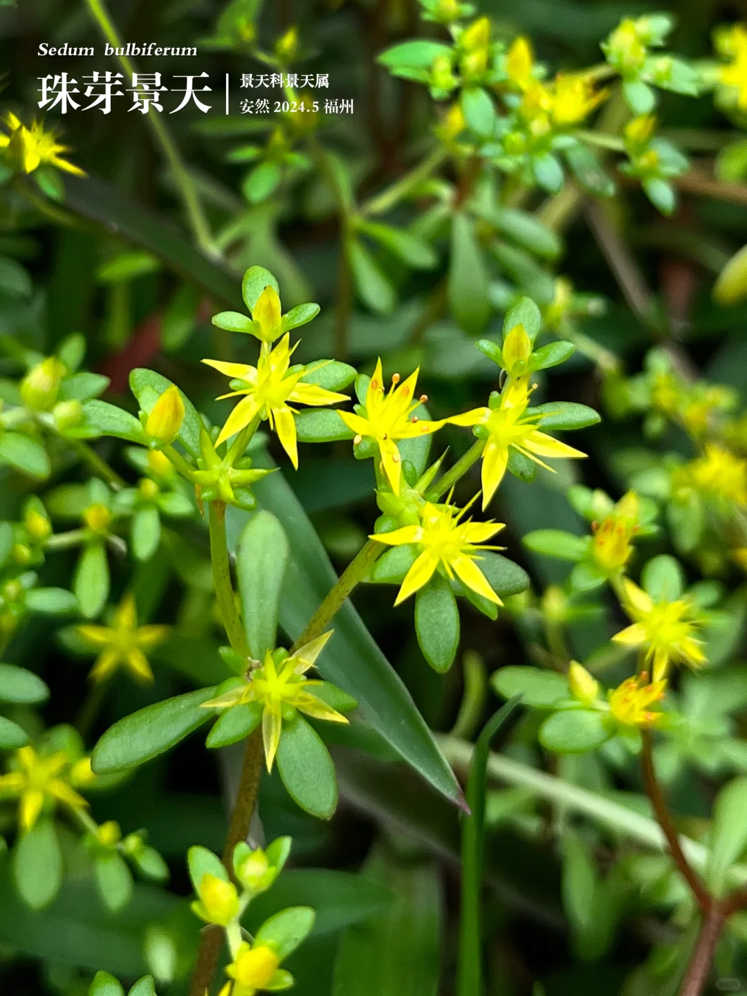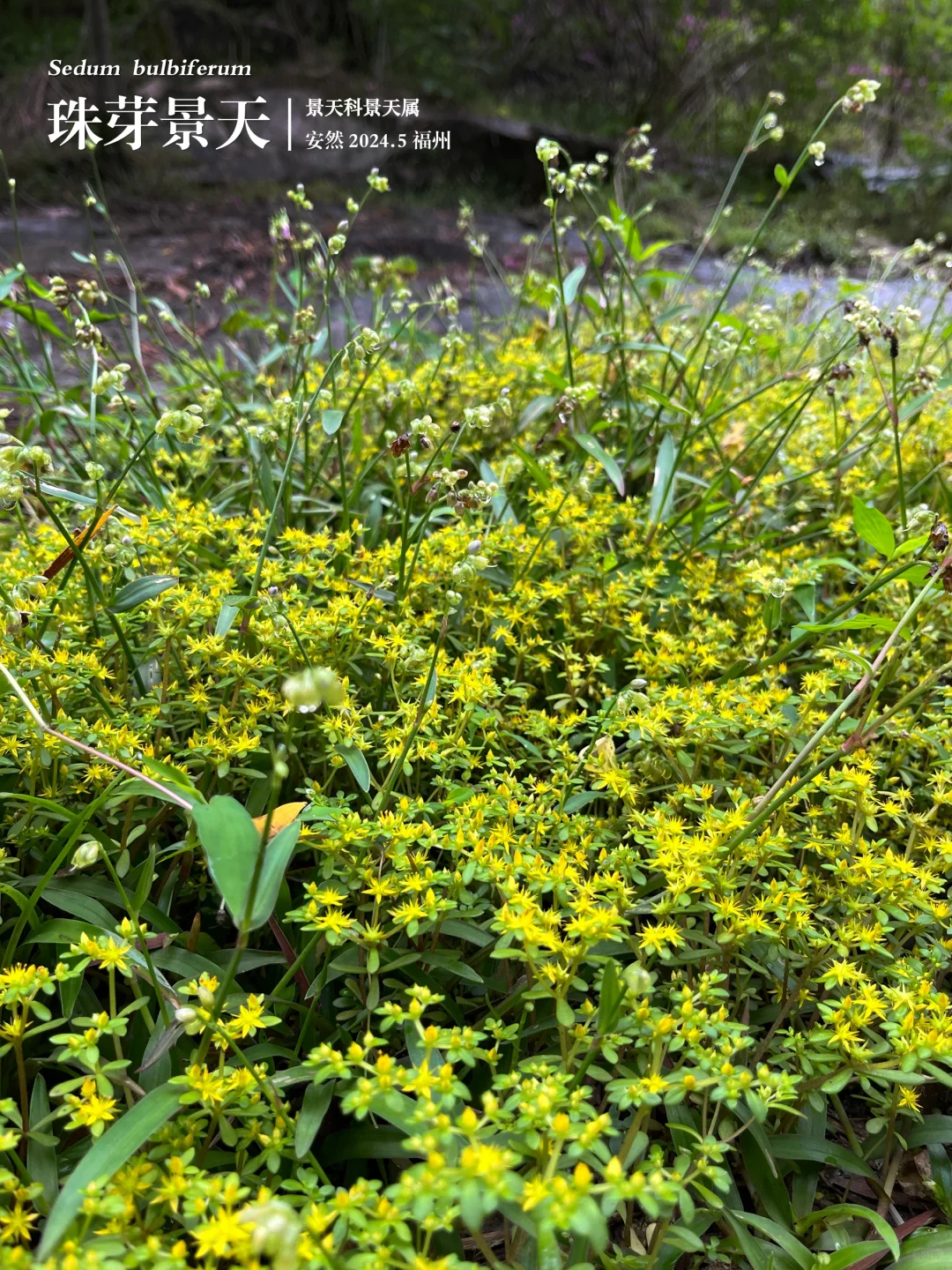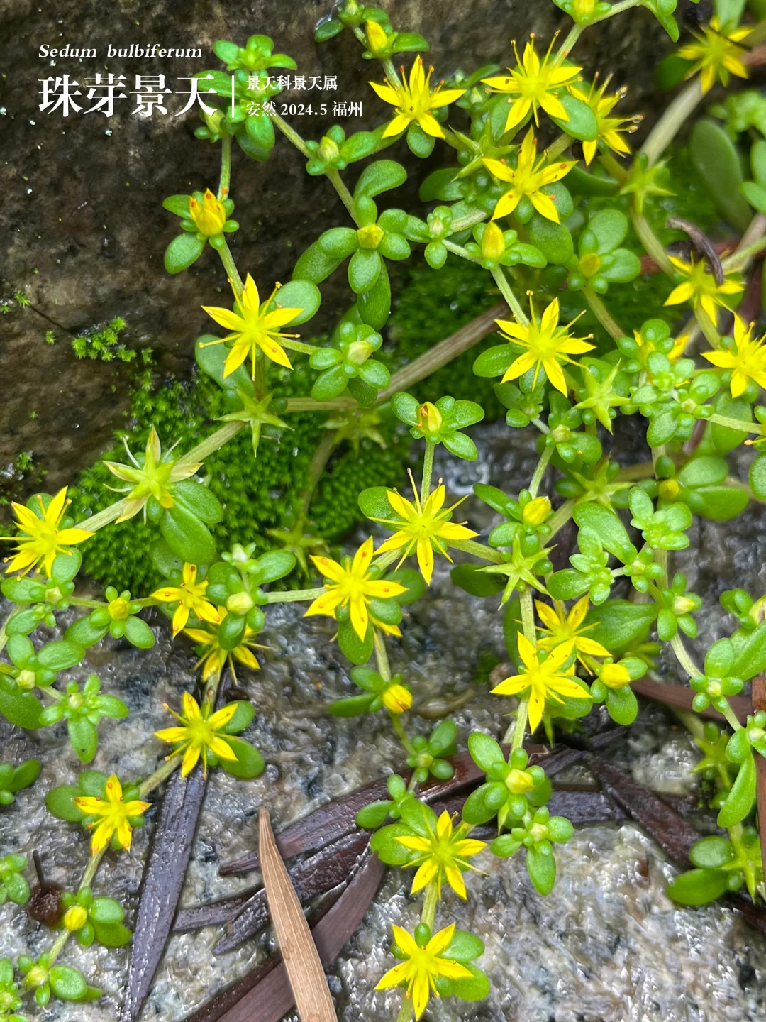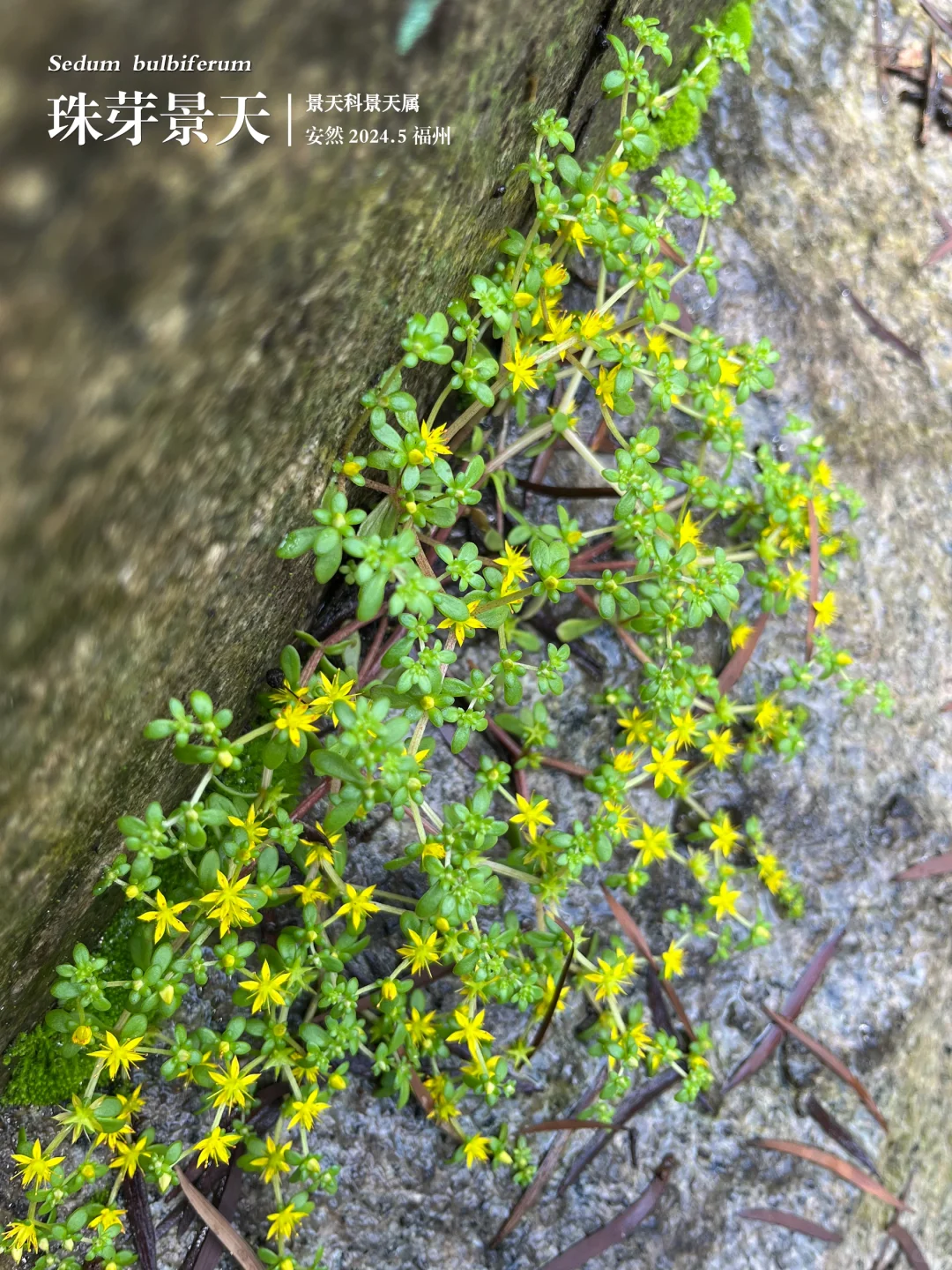 几年前春夏交替时爬鼓山,总能在山脚公路边沟外侧山坡看到一片黄色小花。当时觉得像佛甲草,不过叶子更宽一点,后续得知这种小巧的植物叫珠芽景天。