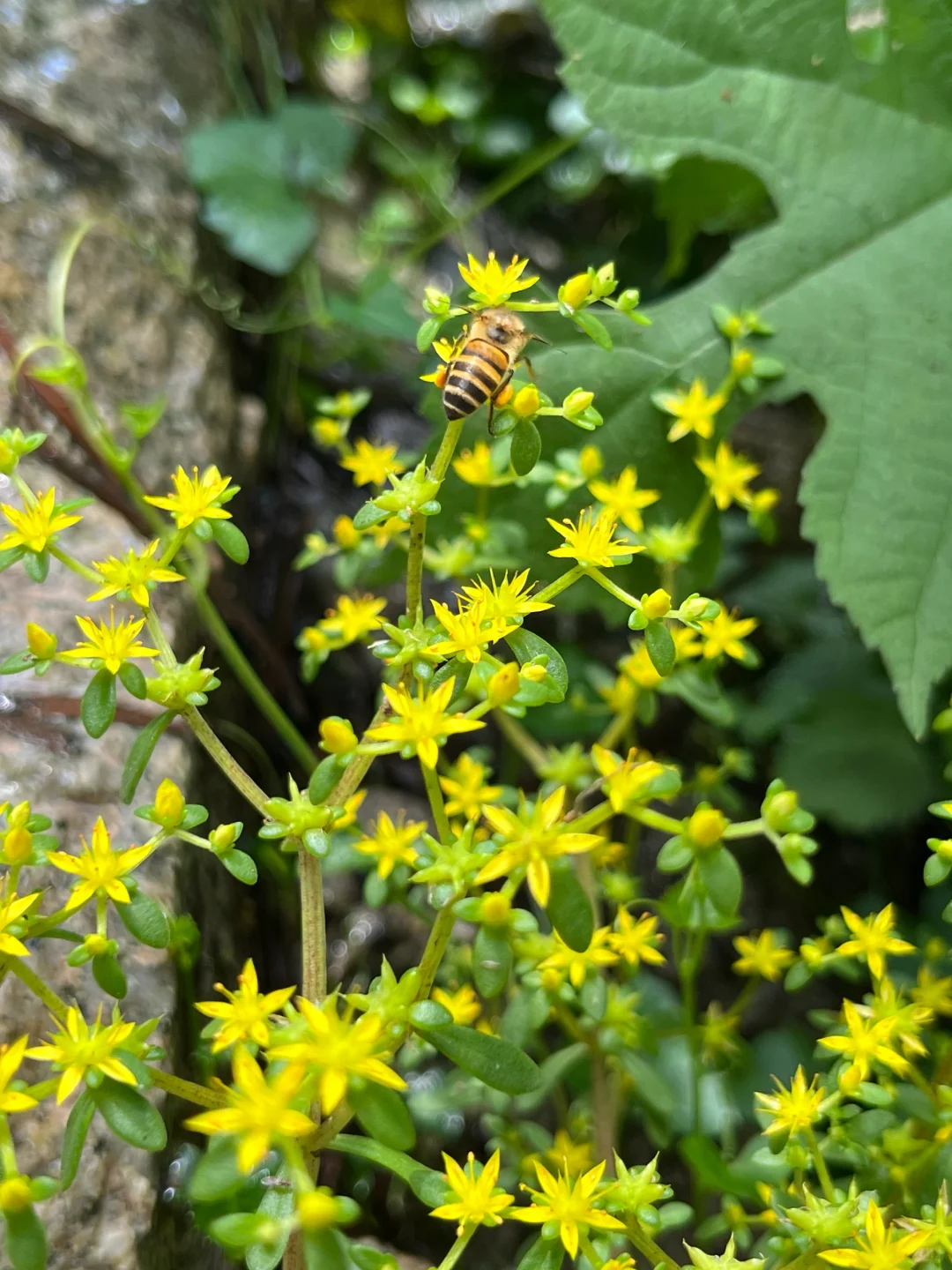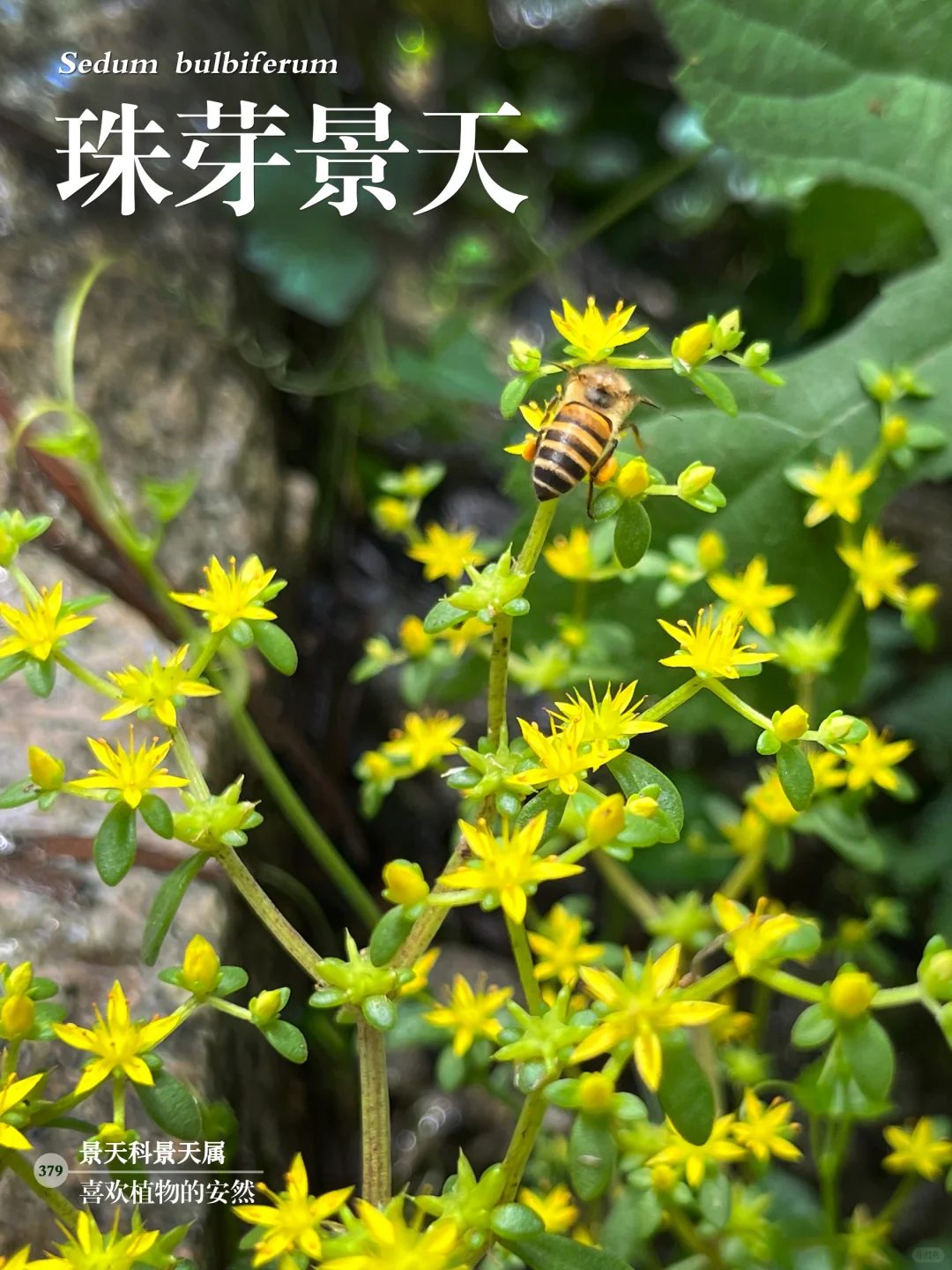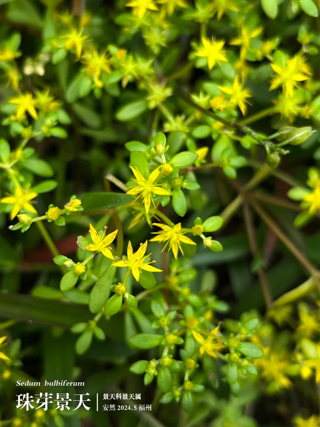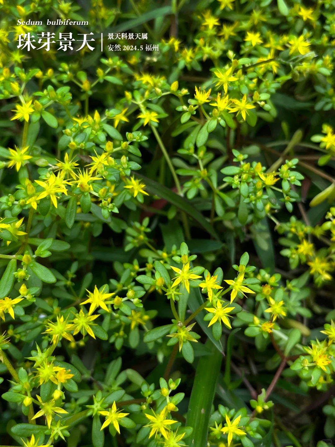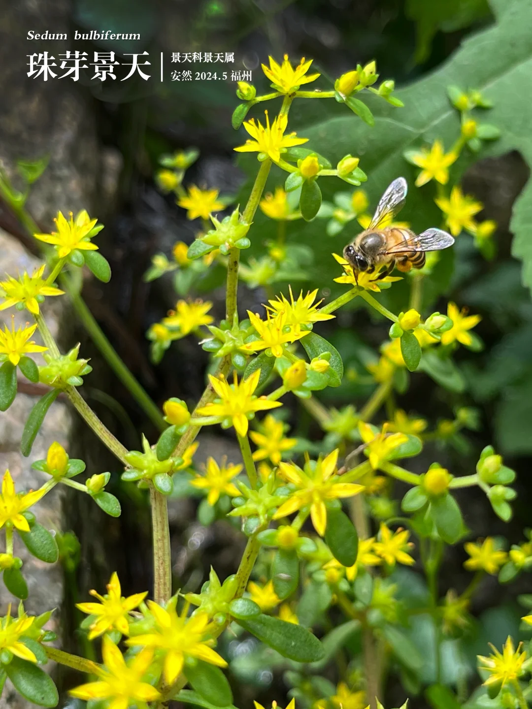 几年前春夏交替时爬鼓山,总能在山脚公路边沟外侧山坡看到一片黄色小花。当时觉得像佛甲草,不过叶子更宽一点,后续得知这种小巧的植物叫珠芽景天。