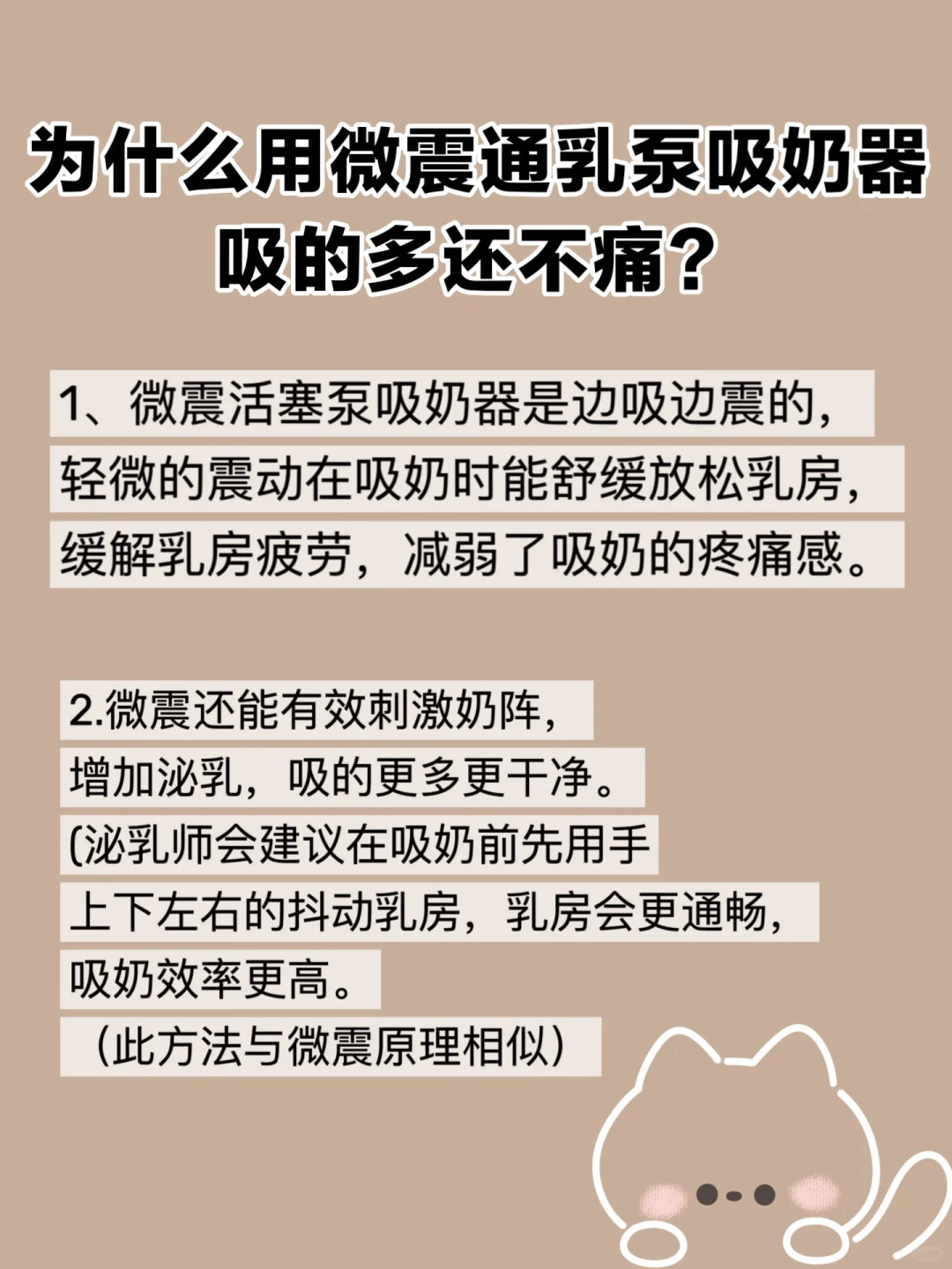 在吸和放的同时会有轻微震动,震动能带来按摩,效果减弱吸奶的不适感,还可以有效刺激奶阵,促进泌乳。
