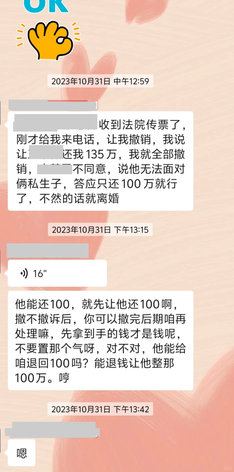 注意:100万的事小3承认了,这是重大阶段性胜利。只是收款人指向“弟弟”,不是本人,还得继续取证。