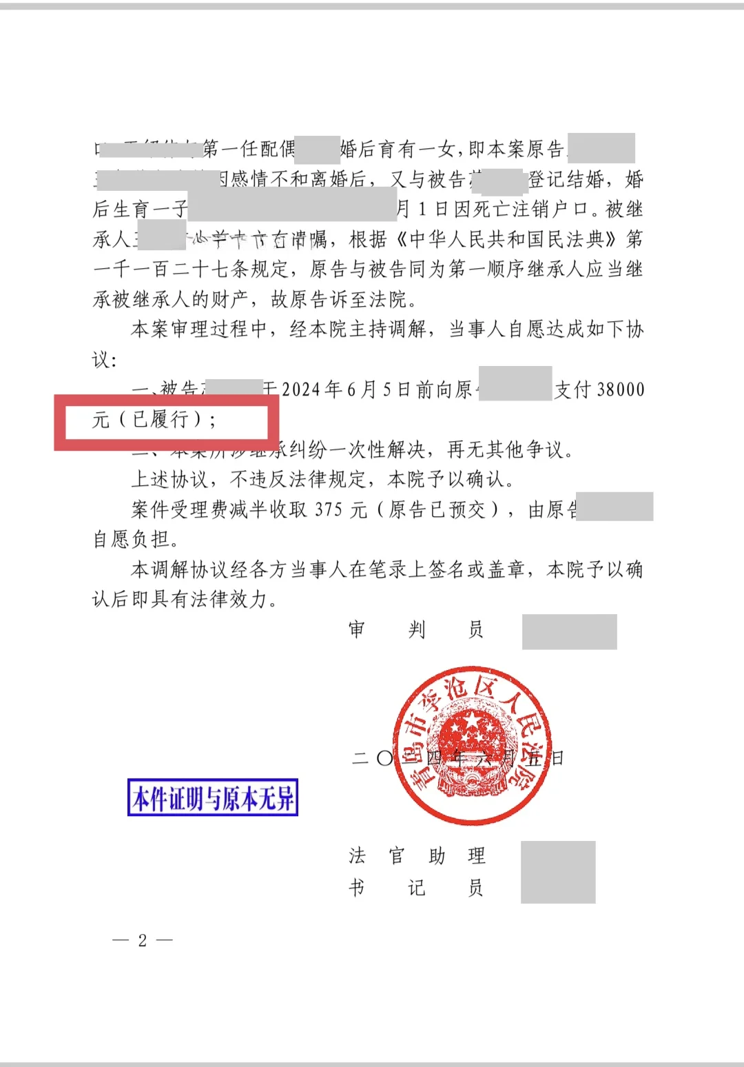 最后,我们就与调解员协商如何为当事人省诉讼费,律师提出把房屋的诉求撤销,只留下38000元遗产分割的事项,我们只担了300多元诉讼费。