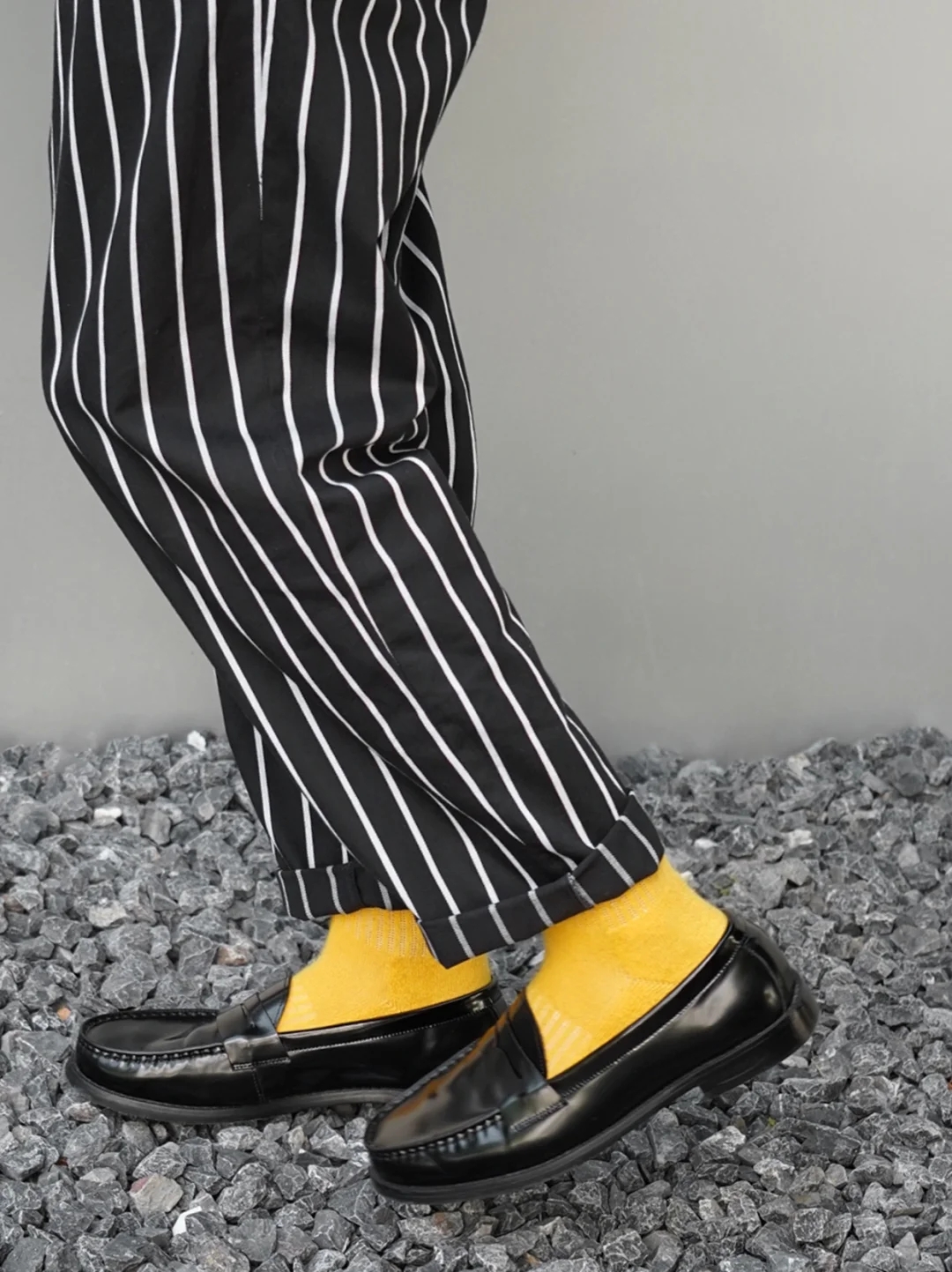 但实际上却非常和谐。黑白条纹与黄油色的搭配,既显得时尚又不失稳重;厨师裤与乐福鞋的组合,既休闲又大气。这样的穿搭,不仅能让你在通勤中保持舒适,还能让你在人群中脱颖而出,展现出独特的魅力与品味。