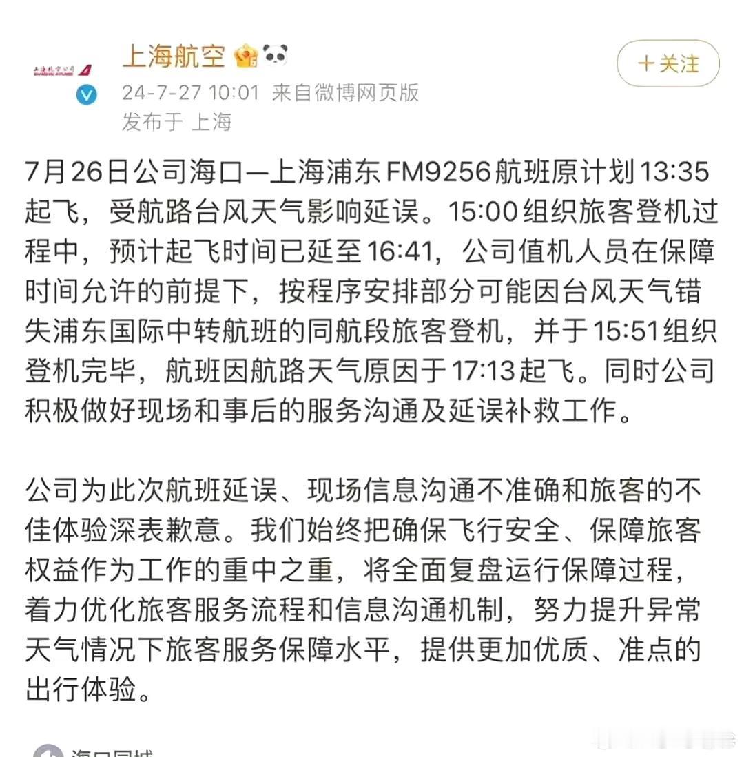 #上海航空被海口美兰机场回复打脸# 上海航空在727日发布了情况说明,解释说延迟起飞三小时不是为了等待14位外国人。 海口美兰机场直接打脸式回应,明确表示延误三个半小时,就是因为上海航空要等待14名外国人。 上海航空,出来给广大观众走两步吧。