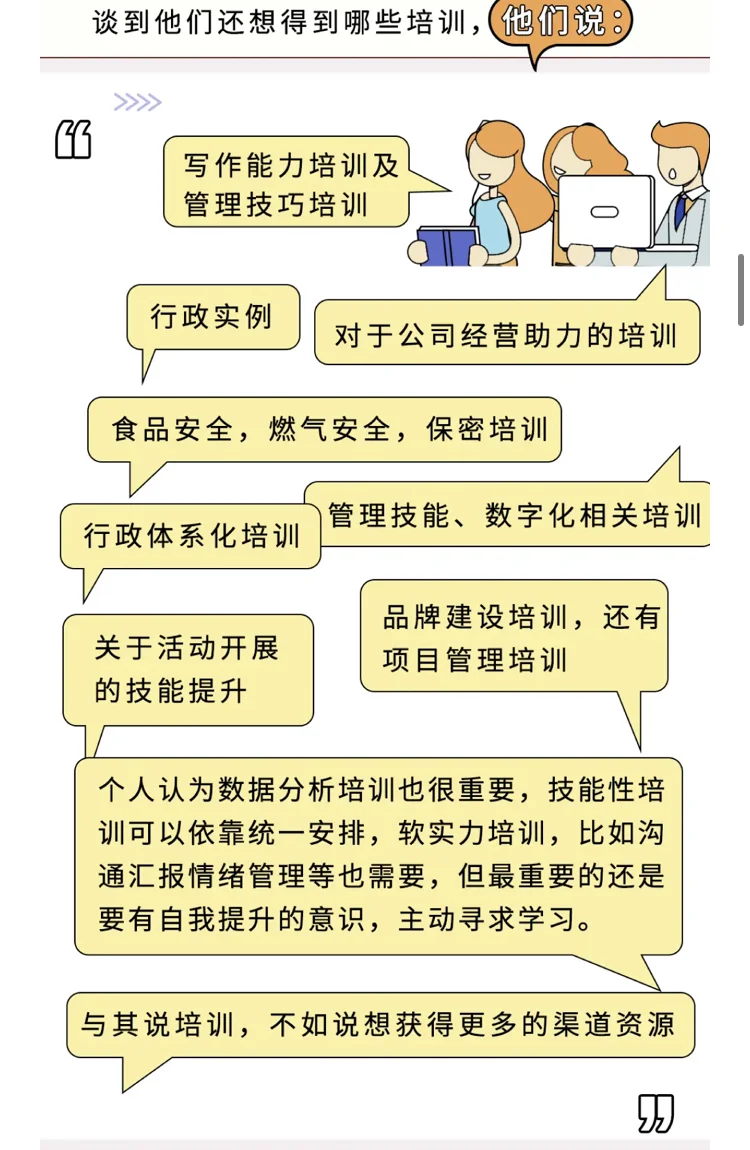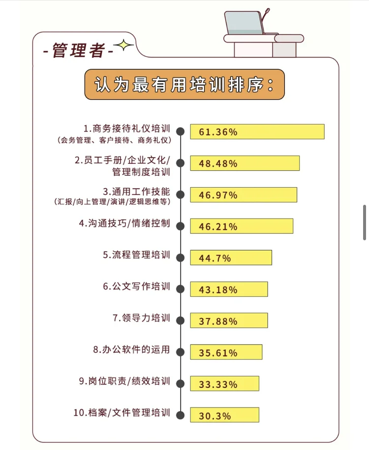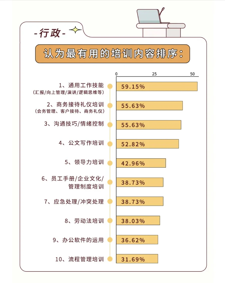 行政作为一个没有专业课程,但对专业性要求逐渐提升的岗位,培训可以说是提升行政专业度和技能水平的重要方式之一了 但行政究竟可以培训哪些内容?哪些培训内容真正有用? 很多行政面对这个问题一筹莫展 前段时间,我们特意发起了一个相关调研,收到8百多份回答,现将调研内容整理如下,希望可以给你们制定培训内容以参考