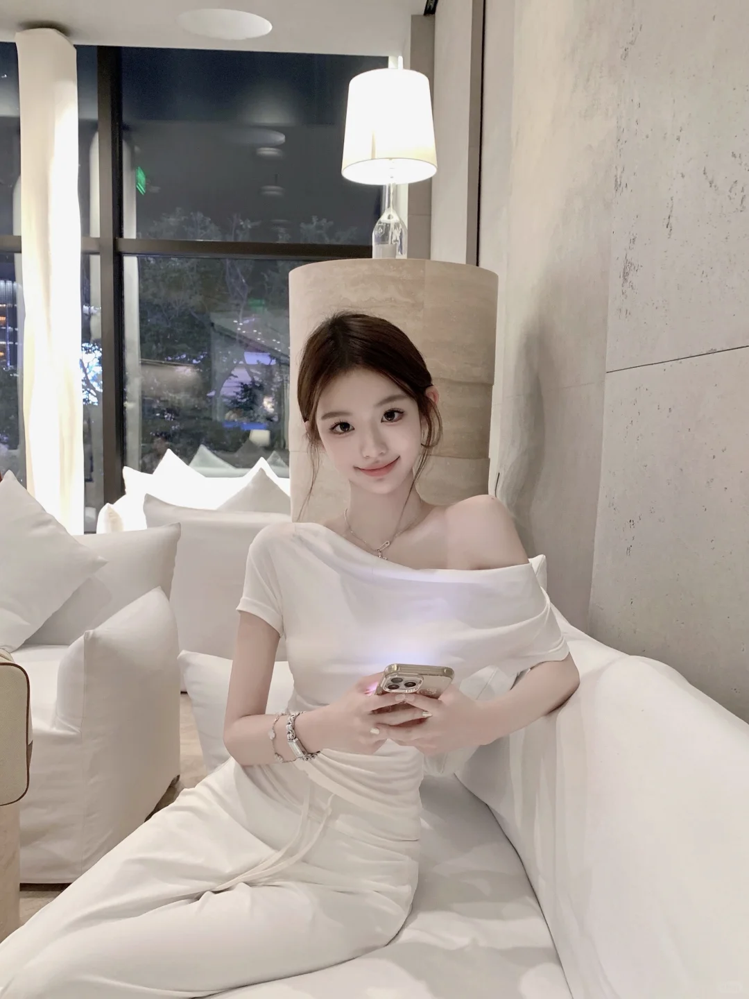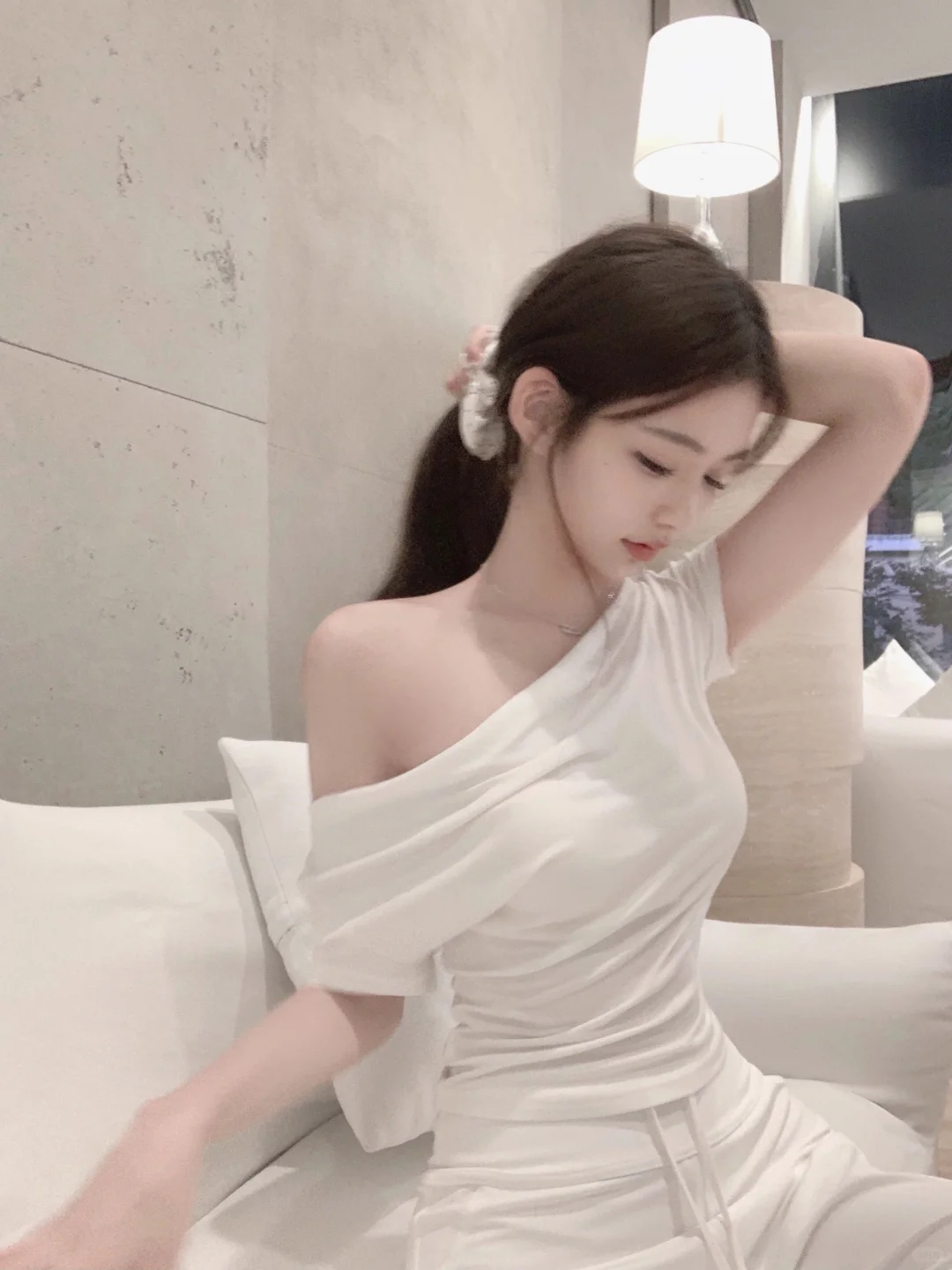 一位长相漂亮、身材出众的姑娘,穿上了一件对身材要求极高的紧身款一字肩粉色针织衫搭