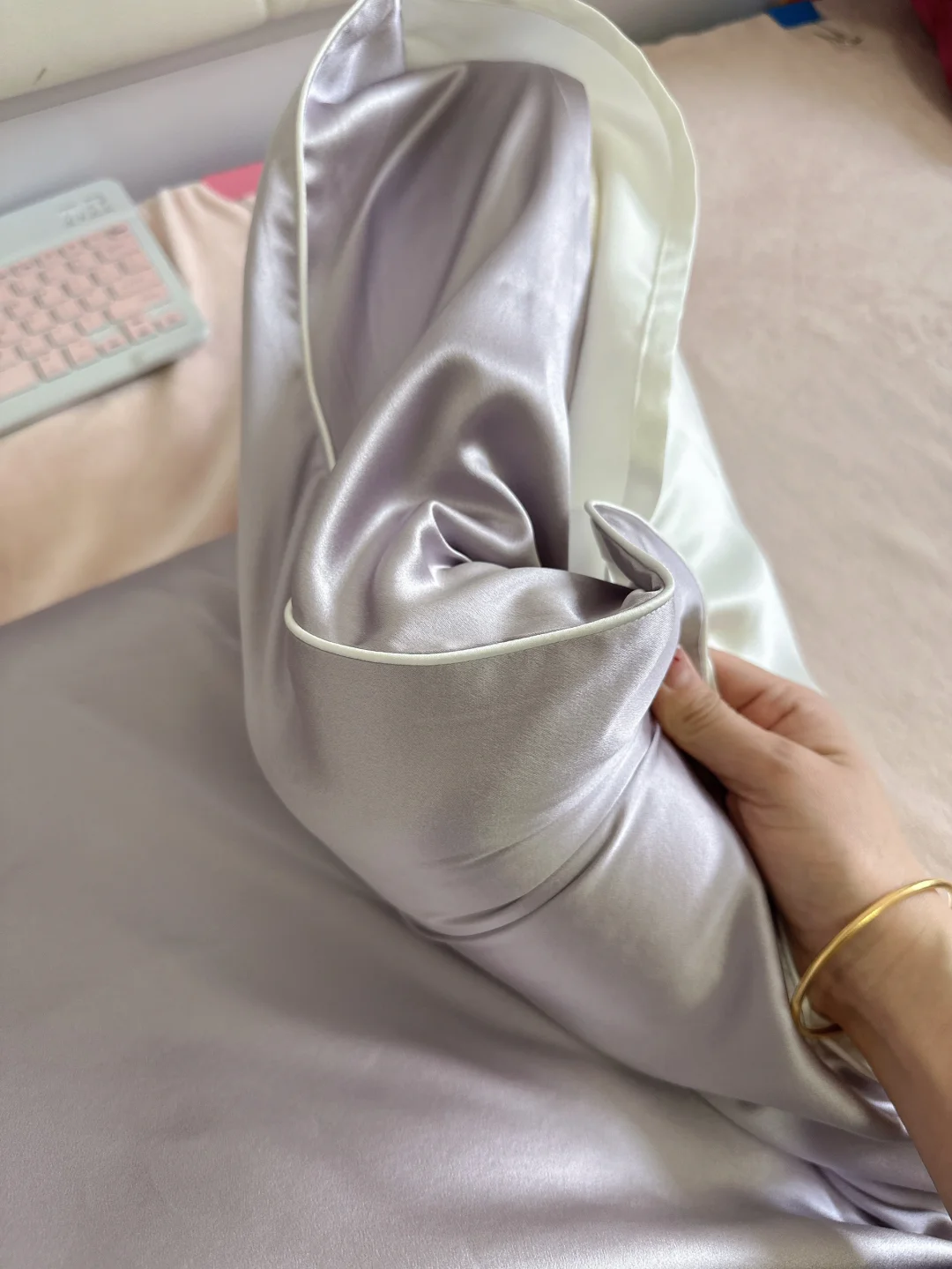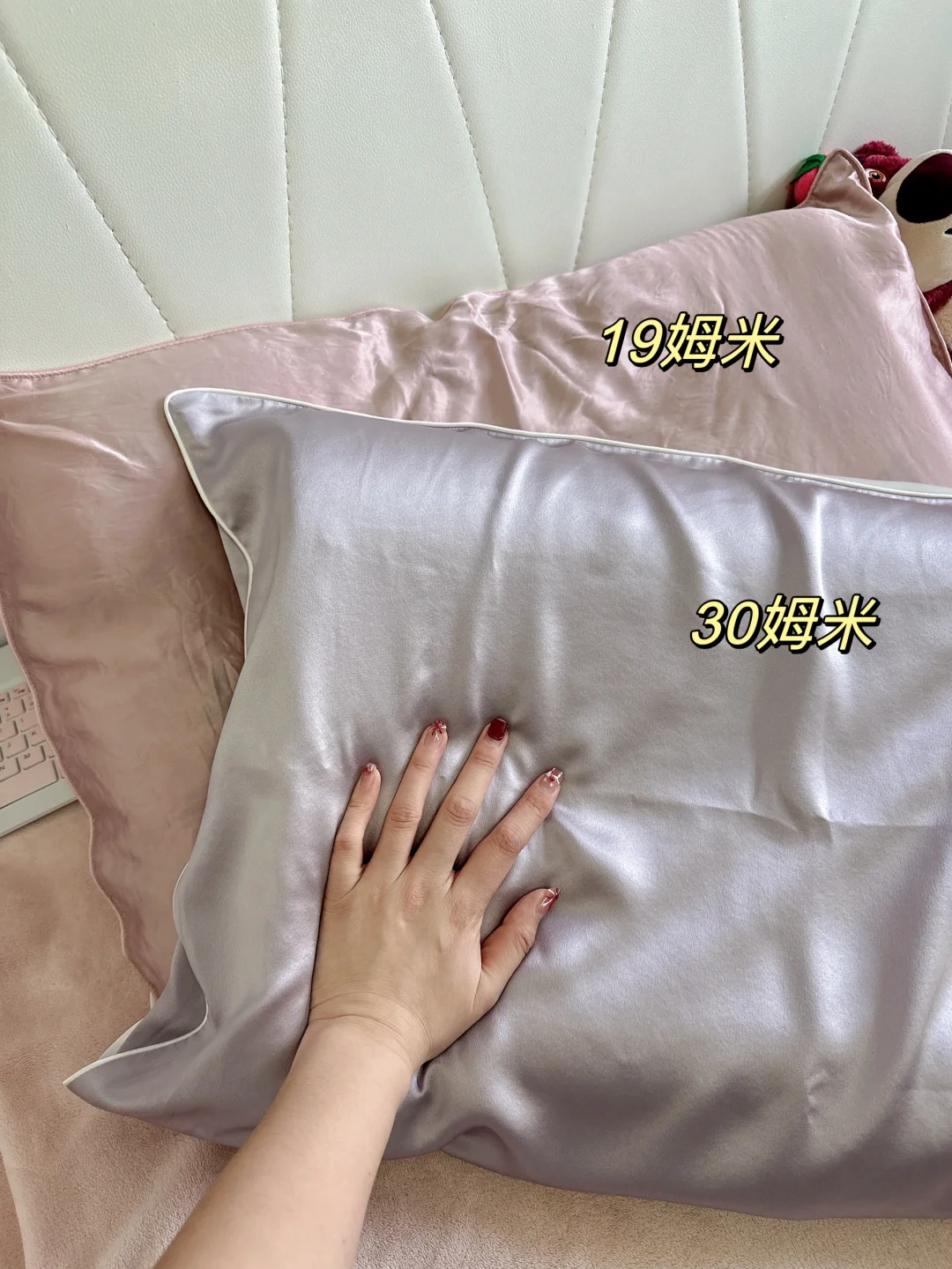 来凡尔赛一下哈哈哈~想改进都没有可以改进的地方[捂脸R][捂脸R],因为不管是面料,还是细节做工全都是给大家用的最好的! [向右R]A级30姆米100%桑蚕丝,一般只有大品牌专柜才会用到的面料,我们给大家拿来做枕套[萌萌哒R]。相比普通真丝枕套更抗皱、不会透,而且是一个可以用七八年都没问题的品质! 四周是插嵌条包边+高克重仿醋酸缎底布,手感就是冰冰凉凉滑滑的,枕上去有陷进去的感觉~超级舒服,我自己用着感觉睡眠质量都好很多!