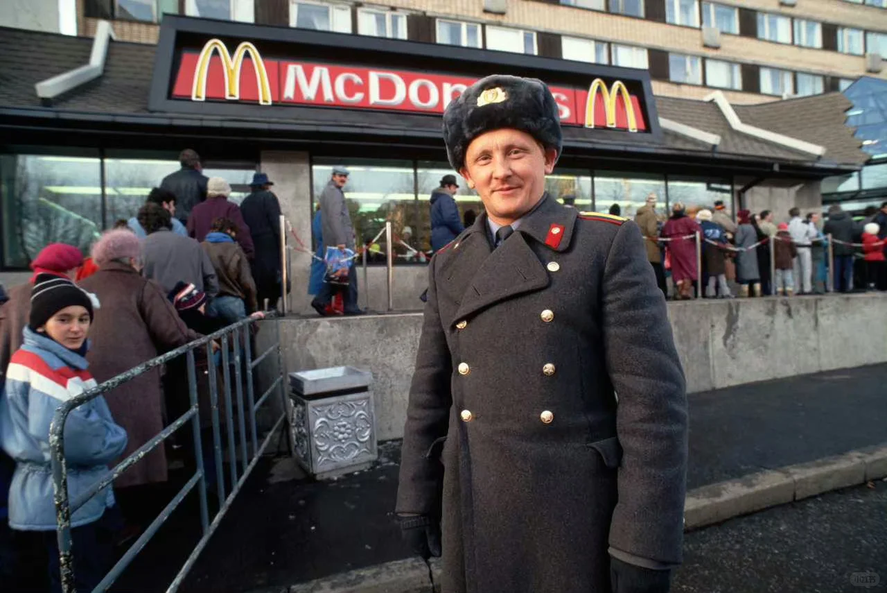 站在苏联第一家麦当劳餐厅外的苏联警察。摄于1990年,莫斯科