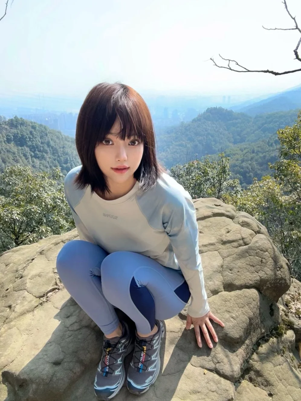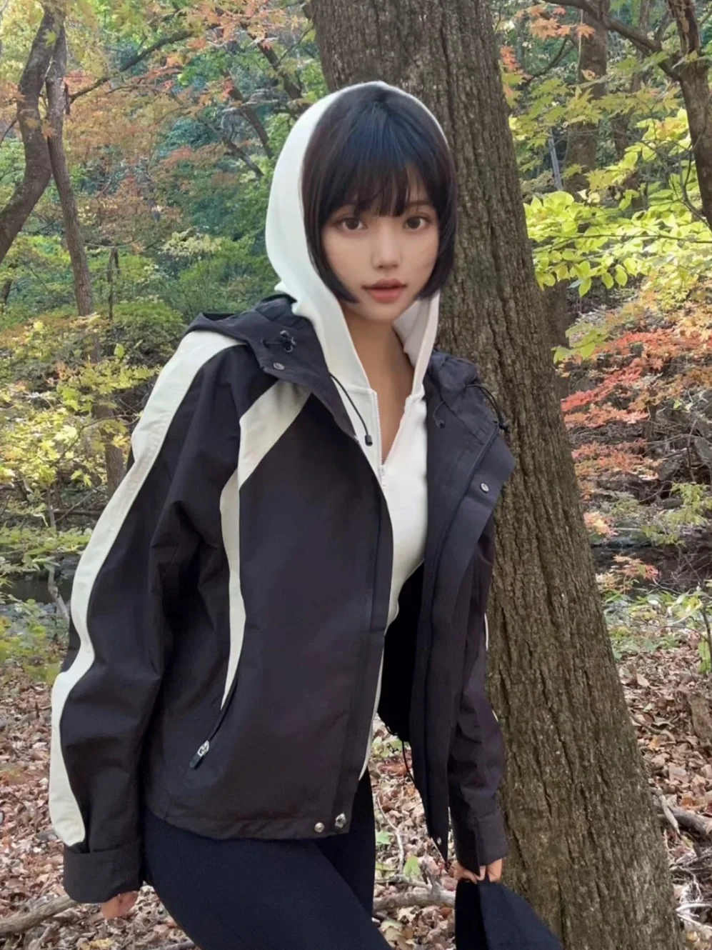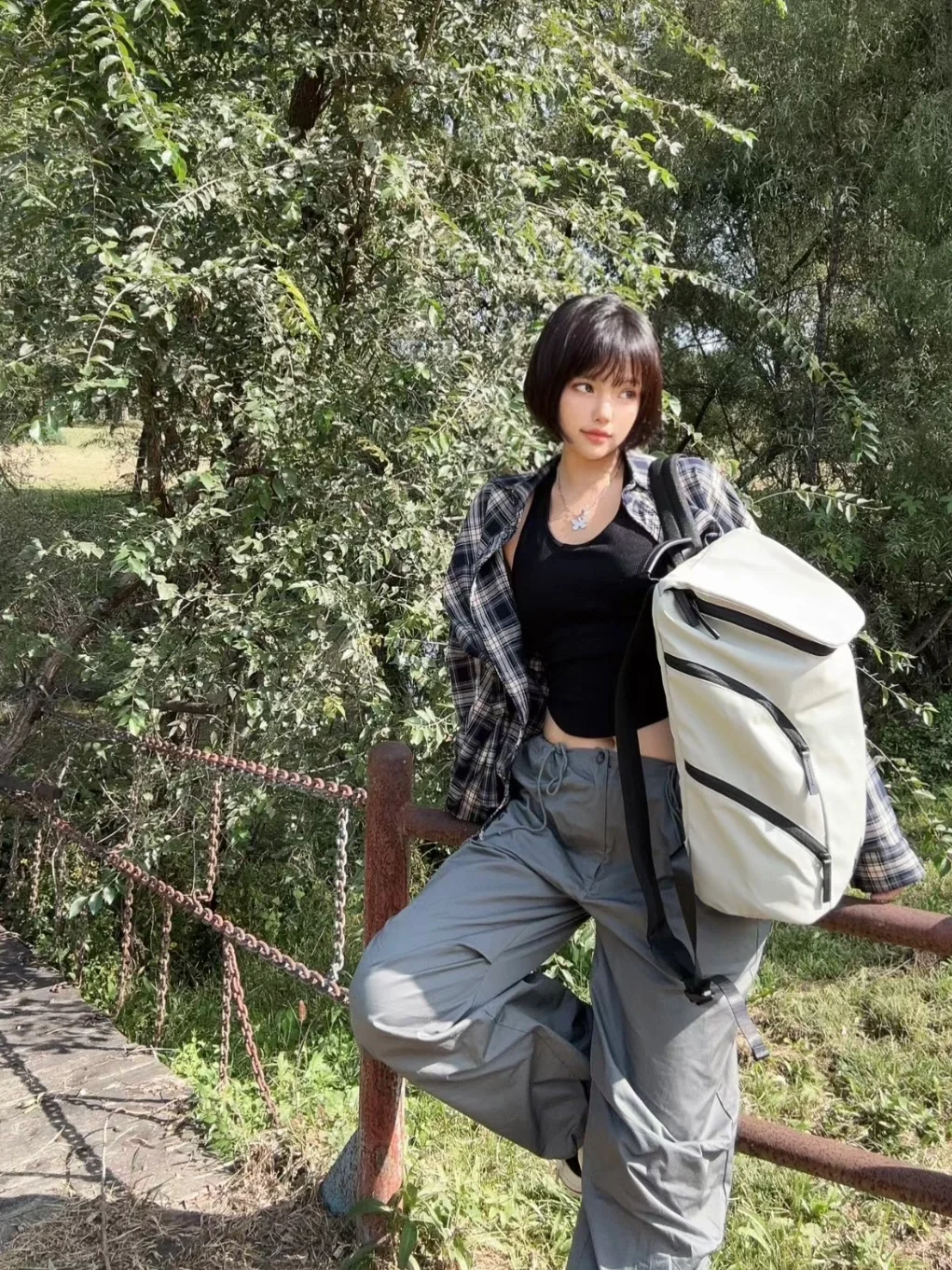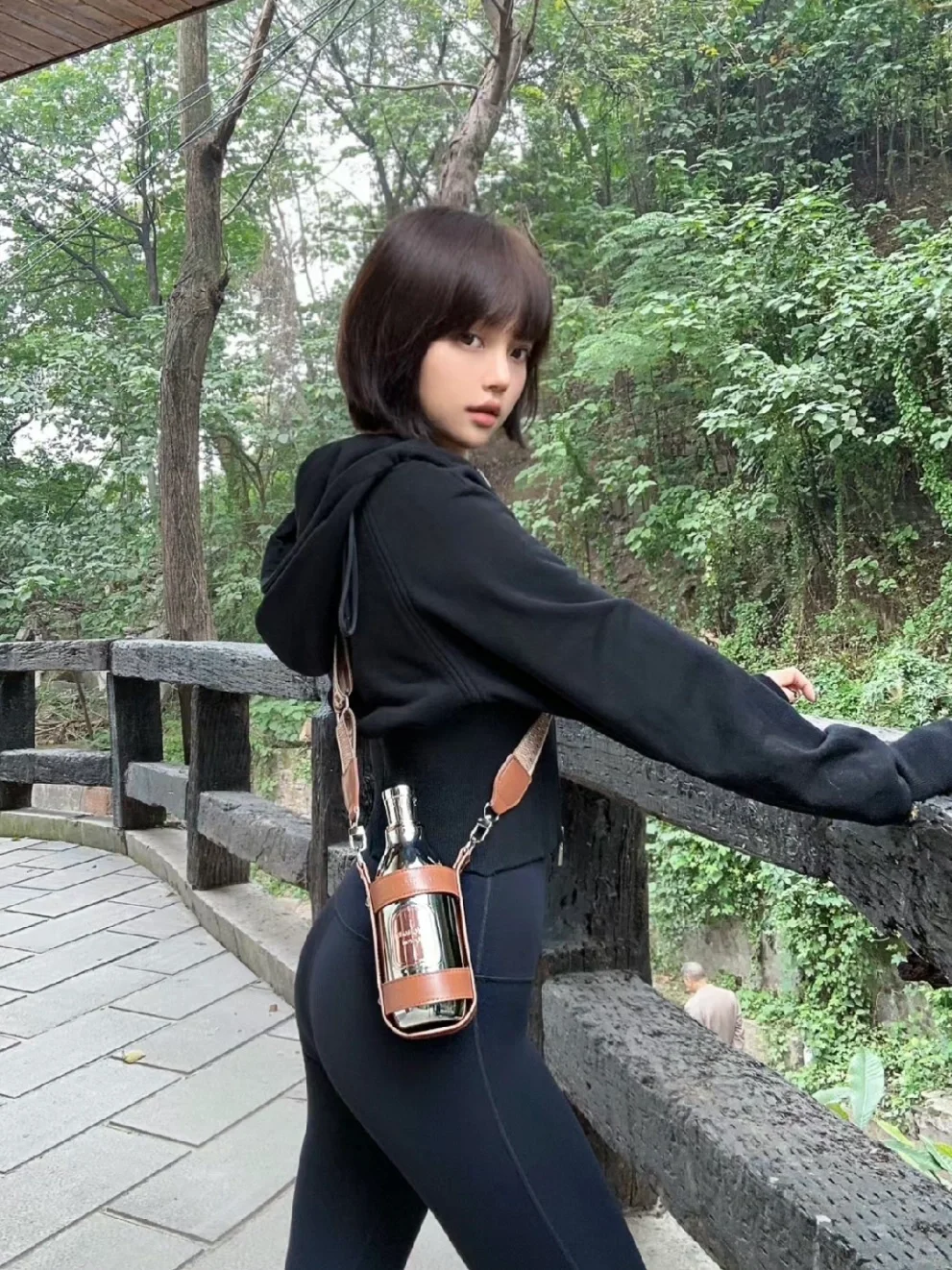 姐姐在溪边美得像幅自然画卷!黑色紧身衣勾勒出曼妙曲线,米色裤装衬得身姿挺拔,低丸