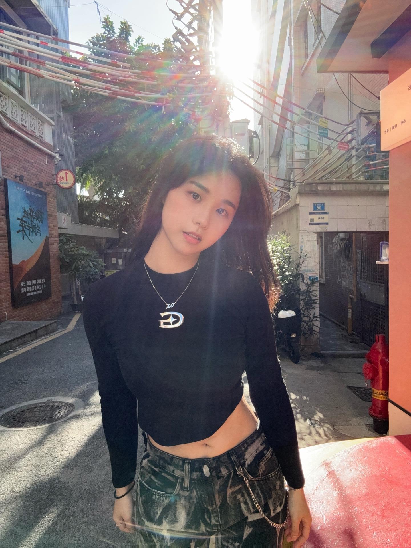 姐姐在溪边美得像幅自然画卷!黑色紧身衣勾勒出曼妙曲线,米色裤装衬得身姿挺拔,低丸