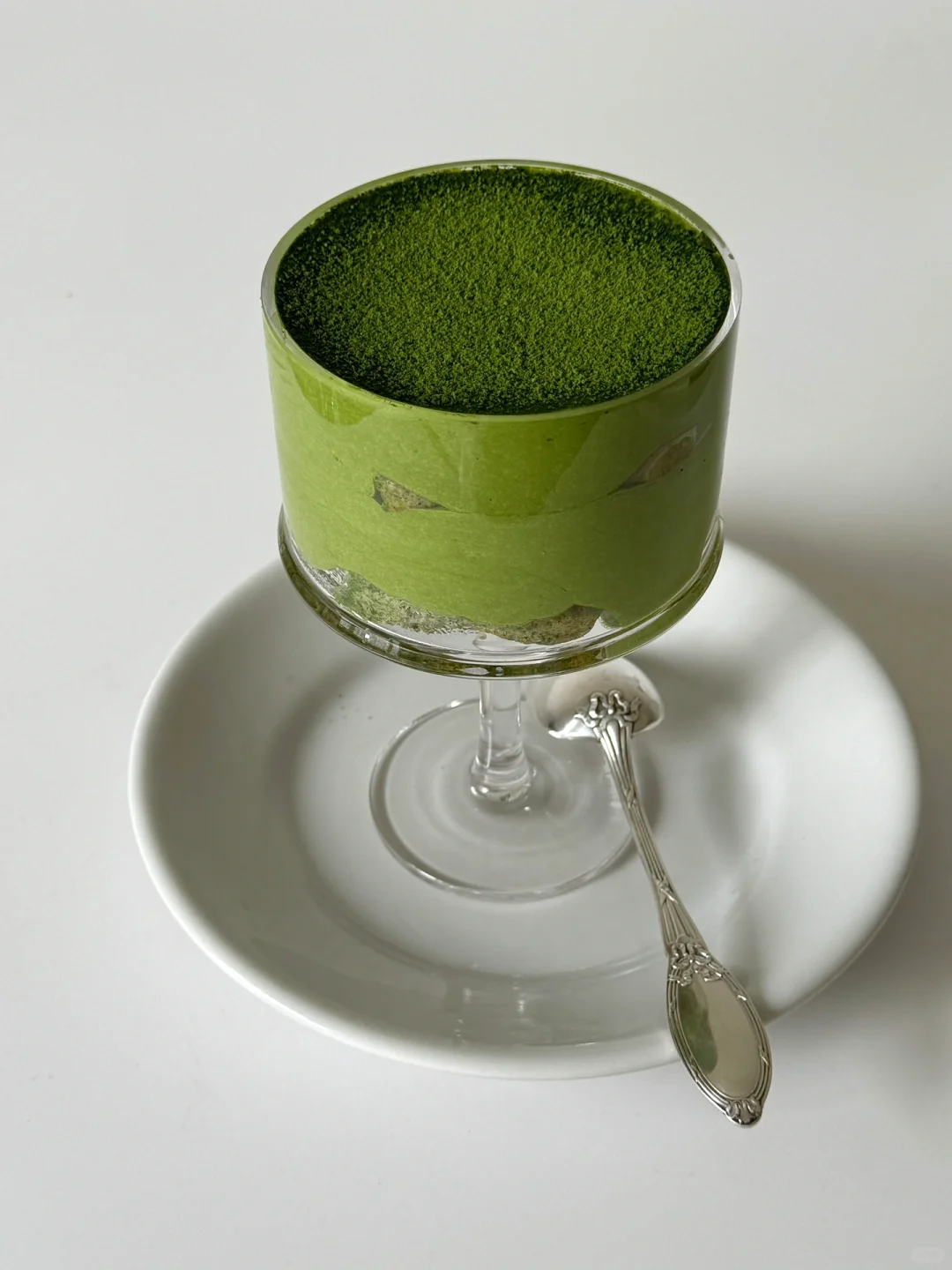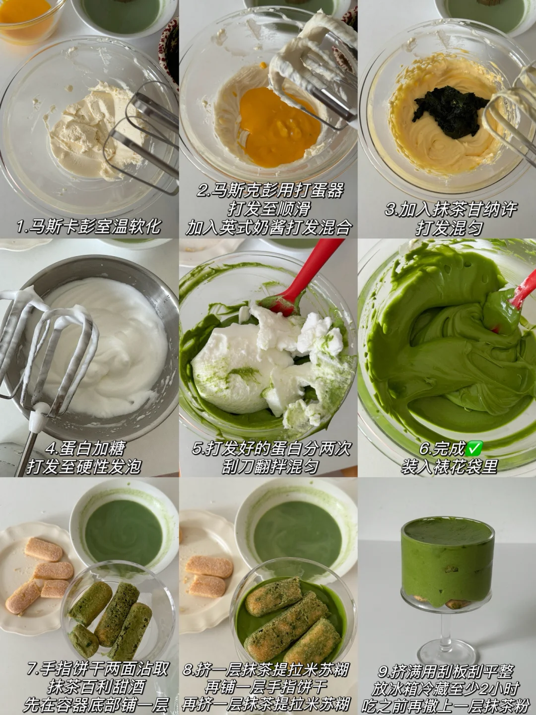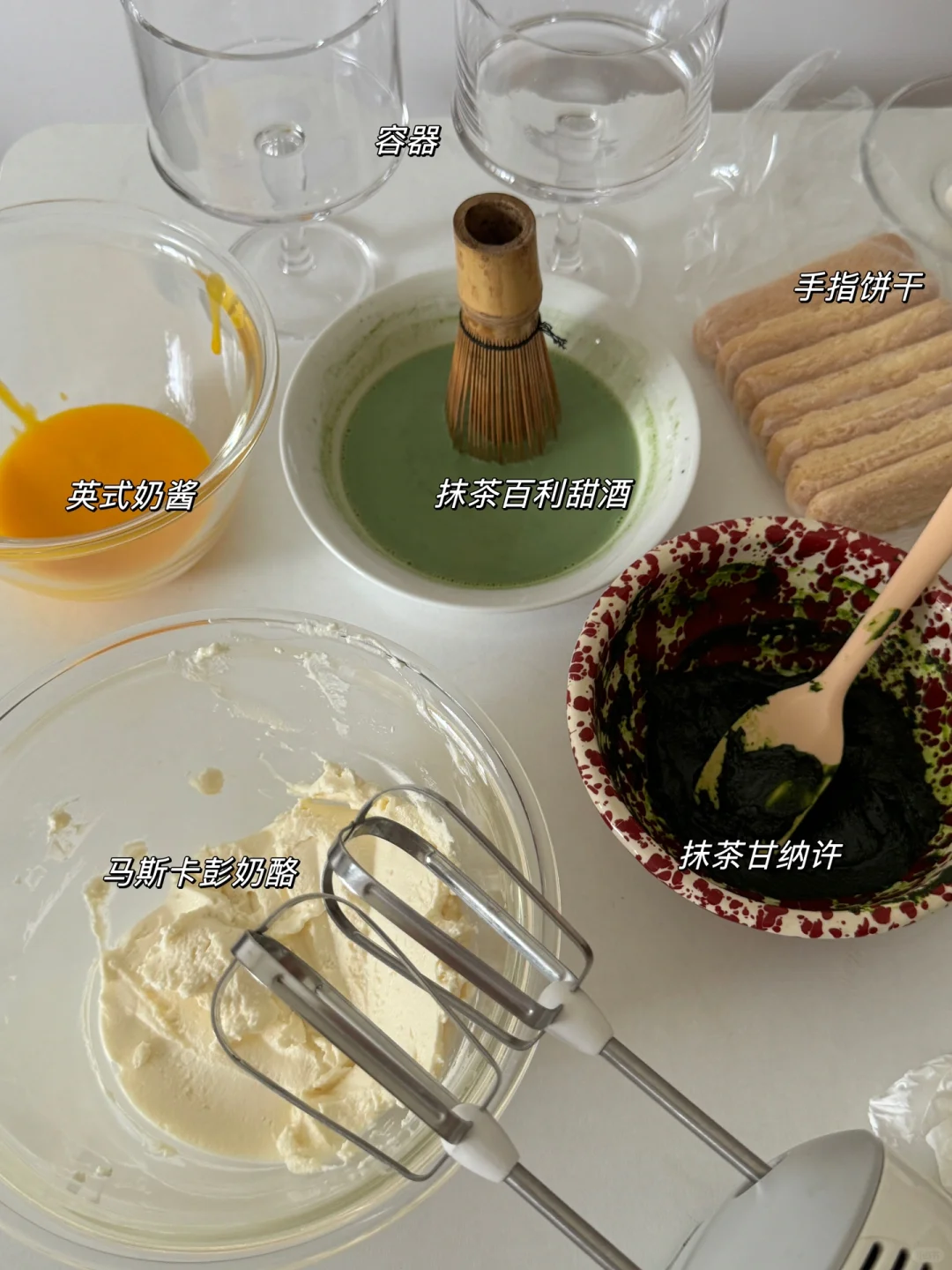 英式奶酱+抹茶甘纳许+马斯卡彭+打发蛋清+手指饼干浸泡抹茶百利甜酒