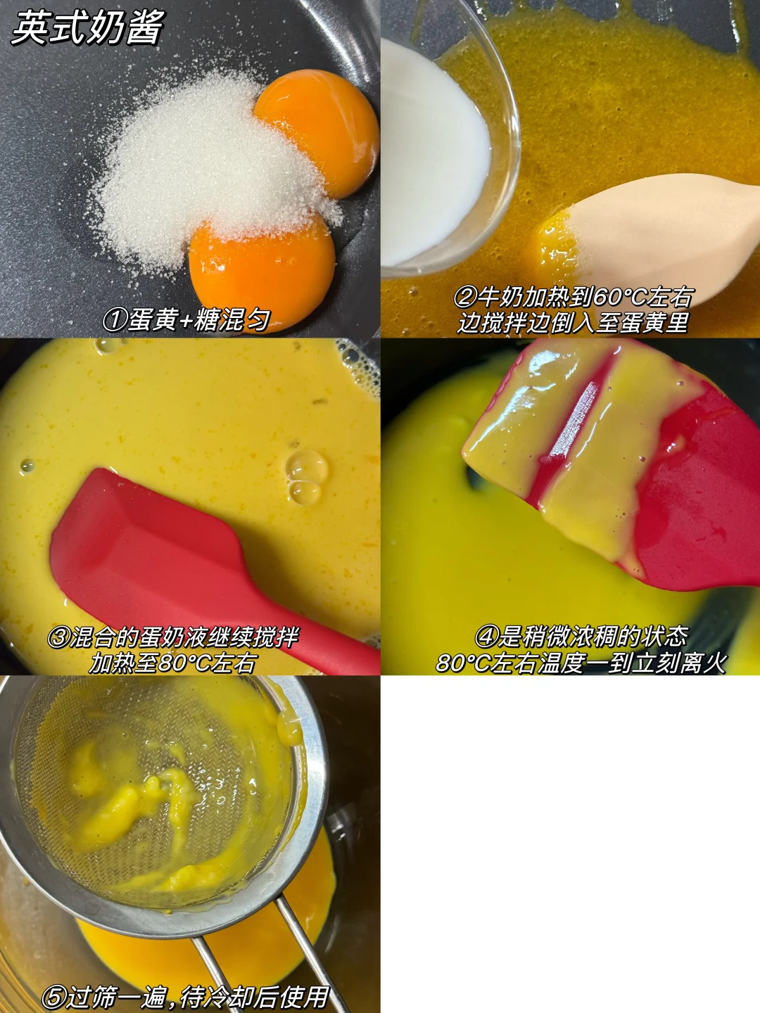 ⒈英式奶酱:蛋黄+糖搅匀,将牛奶加热至60℃左右边倒入边搅拌至蛋液中,再继续小火不断搅拌熬至浓稠大约80℃离火,熬好的英式奶酱过筛一遍冷却备用。