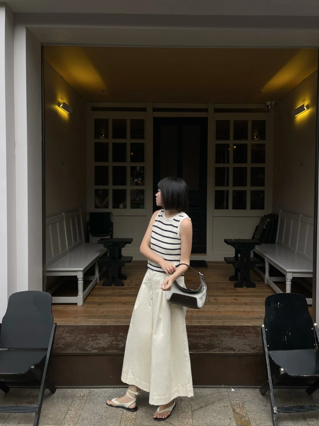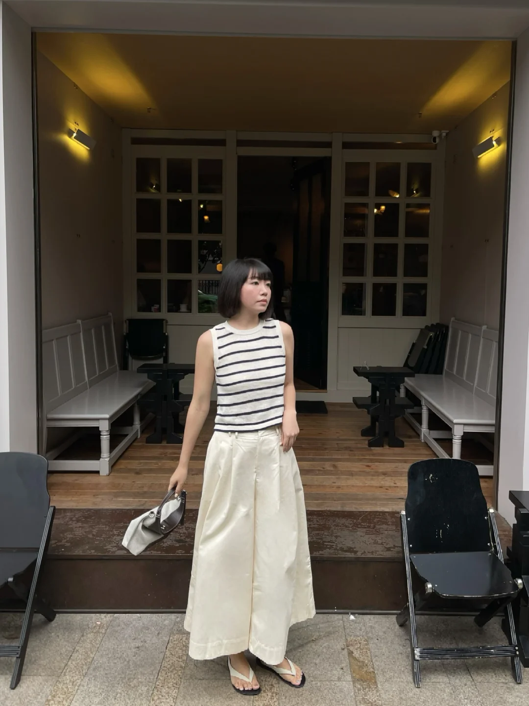 少女清新穿搭,黄色吊带裙搭配米色长裤,轻松惬意。