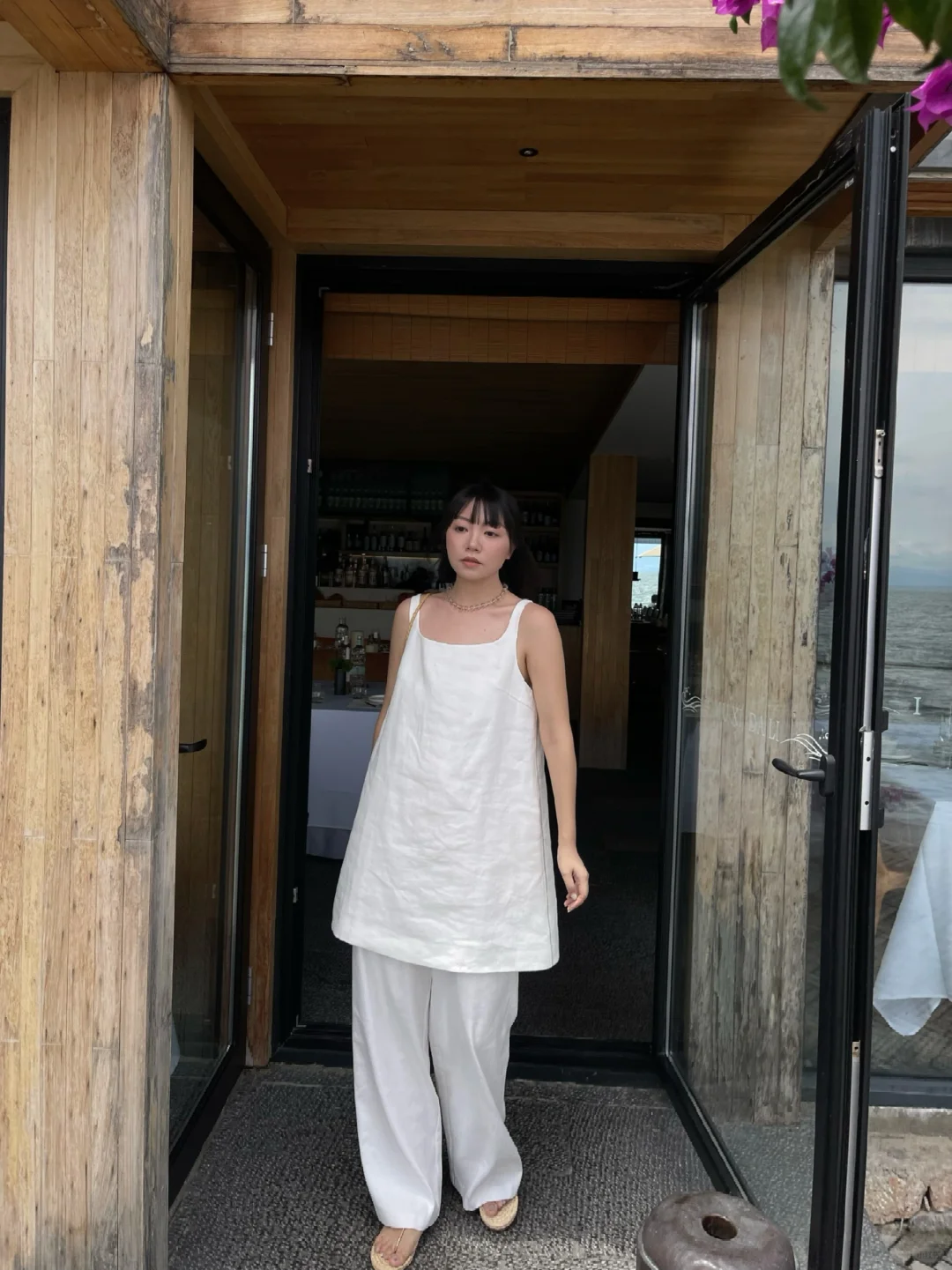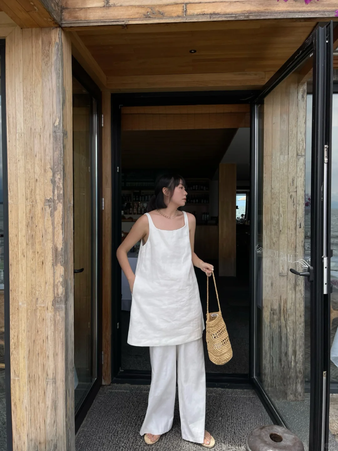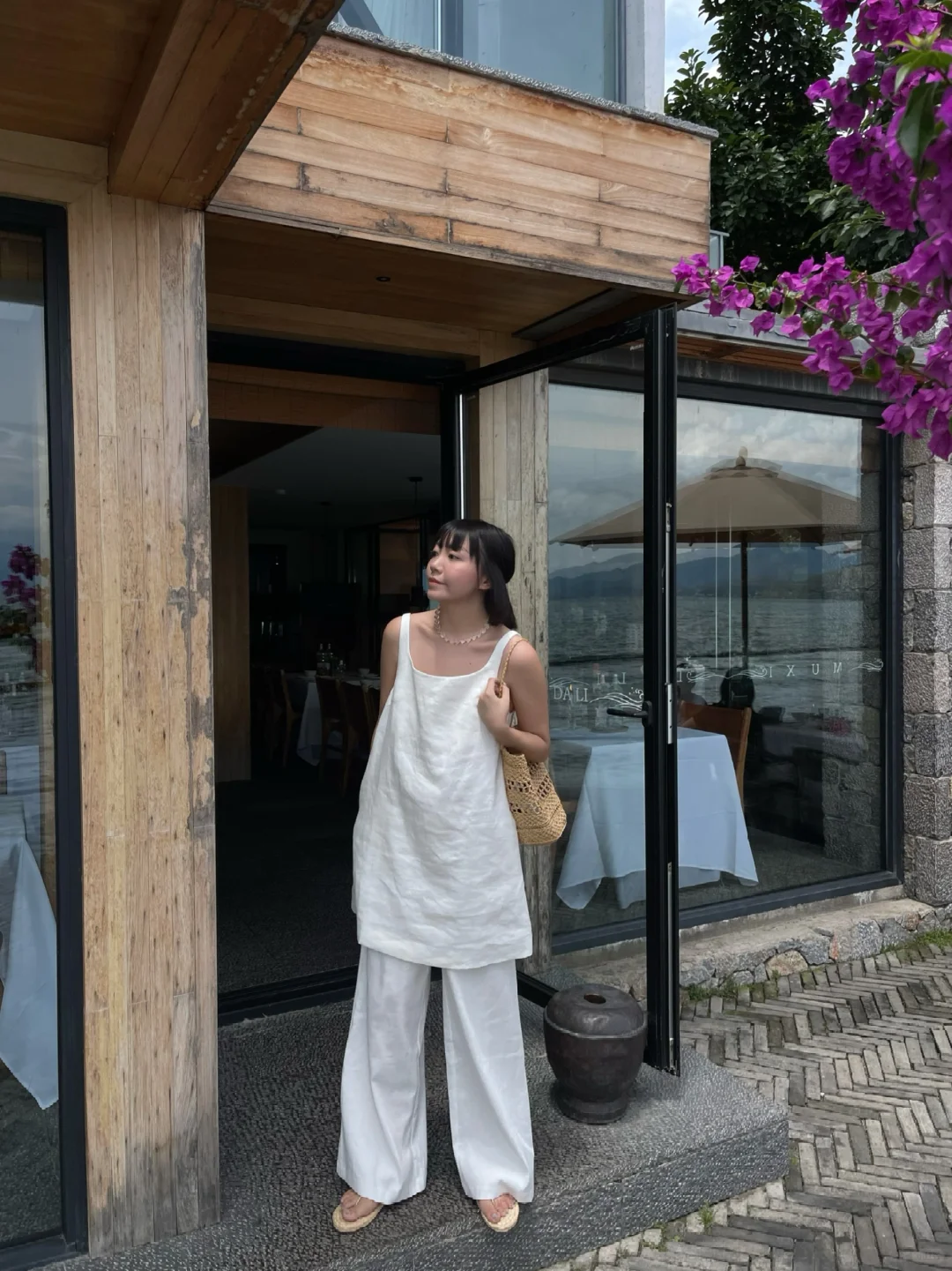 少女清新穿搭,黄色吊带裙搭配米色长裤,轻松惬意。