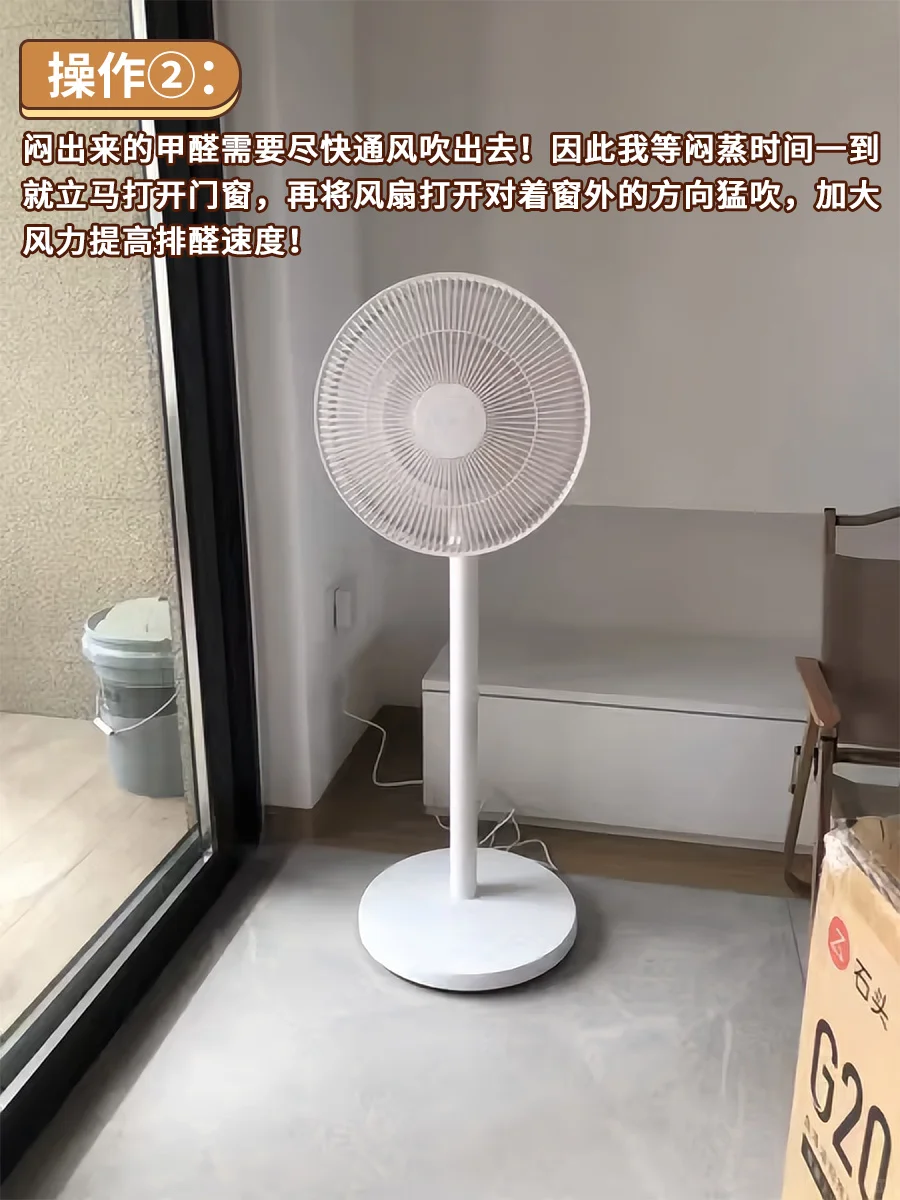 操作[二R]:闷出来的甲醛需要尽快通风吹出去!因此我等闷蒸时间一到就立马打开门窗,再将风扇打开对着窗外的方向猛吹,加大风力提高排醛速度!