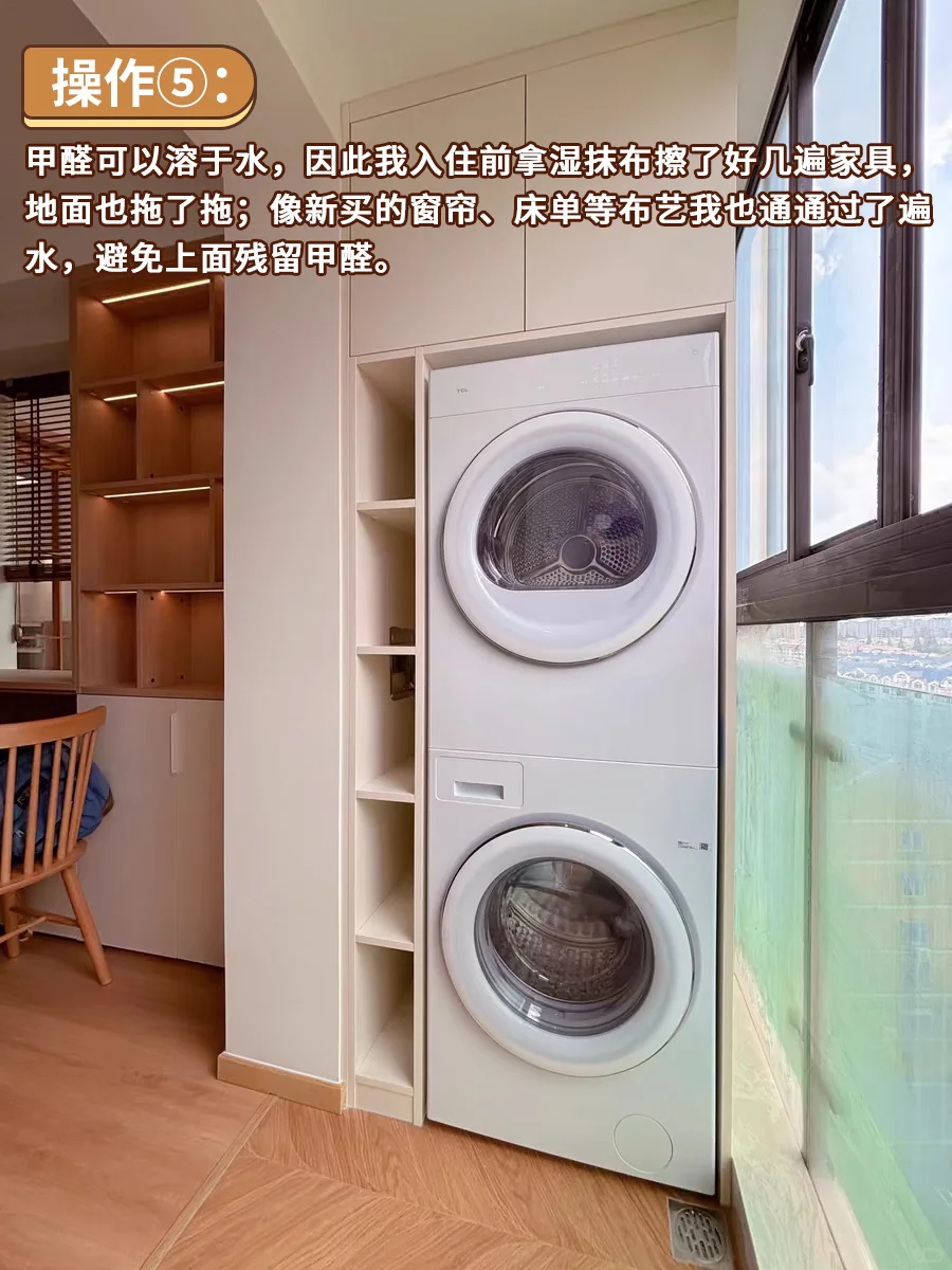 操作[五R]:甲醛可以溶于水,因此我入住前拿湿抹布擦了好几遍家具,地面也拖了拖;像新买的窗帘、床单等布艺我也通通过了遍水,避免上面残留甲醛。