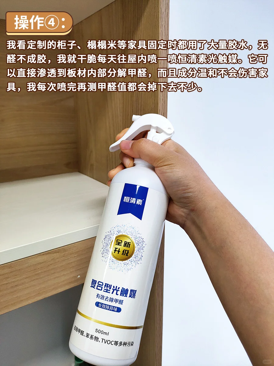 操作[四R]:我看定制的柜子、榻榻米等家具固定时都用了大量胶水,无醛不成胶,我就干脆每天往屋内喷一喷恒清素光触媒。它可以直接渗透到板材内部分解甲醛,而且成分温和不会伤害家具🛋我每次喷完再测甲醛值都会掉下去不少。