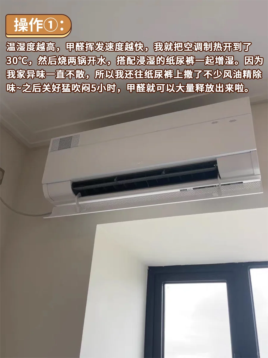 操作[一R]:温湿度越高,甲醛挥发速度越快,我就把空调制热开到了30℃,然后烧两锅开水,搭配浸湿的纸尿裤一起增湿。因为我家异味一直不散🌀所以我还往纸尿裤上撒了不少风油精除味~之后关好猛吹闷5小时,甲醛就可以大量释放出来啦。