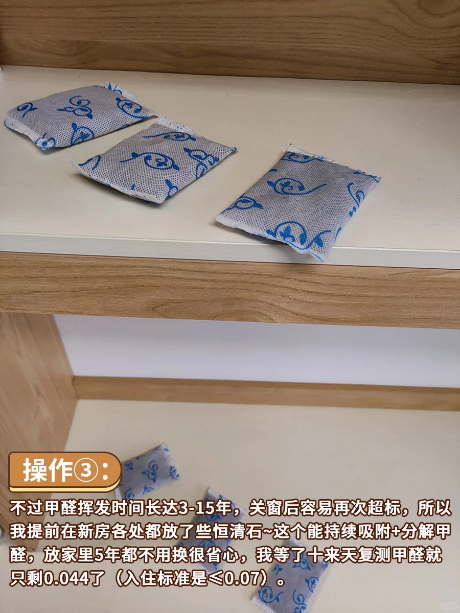 操作[三R]:不过甲醛挥发时间长达3-15年,关窗后容易再次超标,所以我提前在新房各处都放了些恒清石[海豚R]这个能持续吸附+分解甲醛,放家里5年都不用换很省心,我等了十来天复测甲醛就只剩0.044了(入住标准是≤0.07)。
