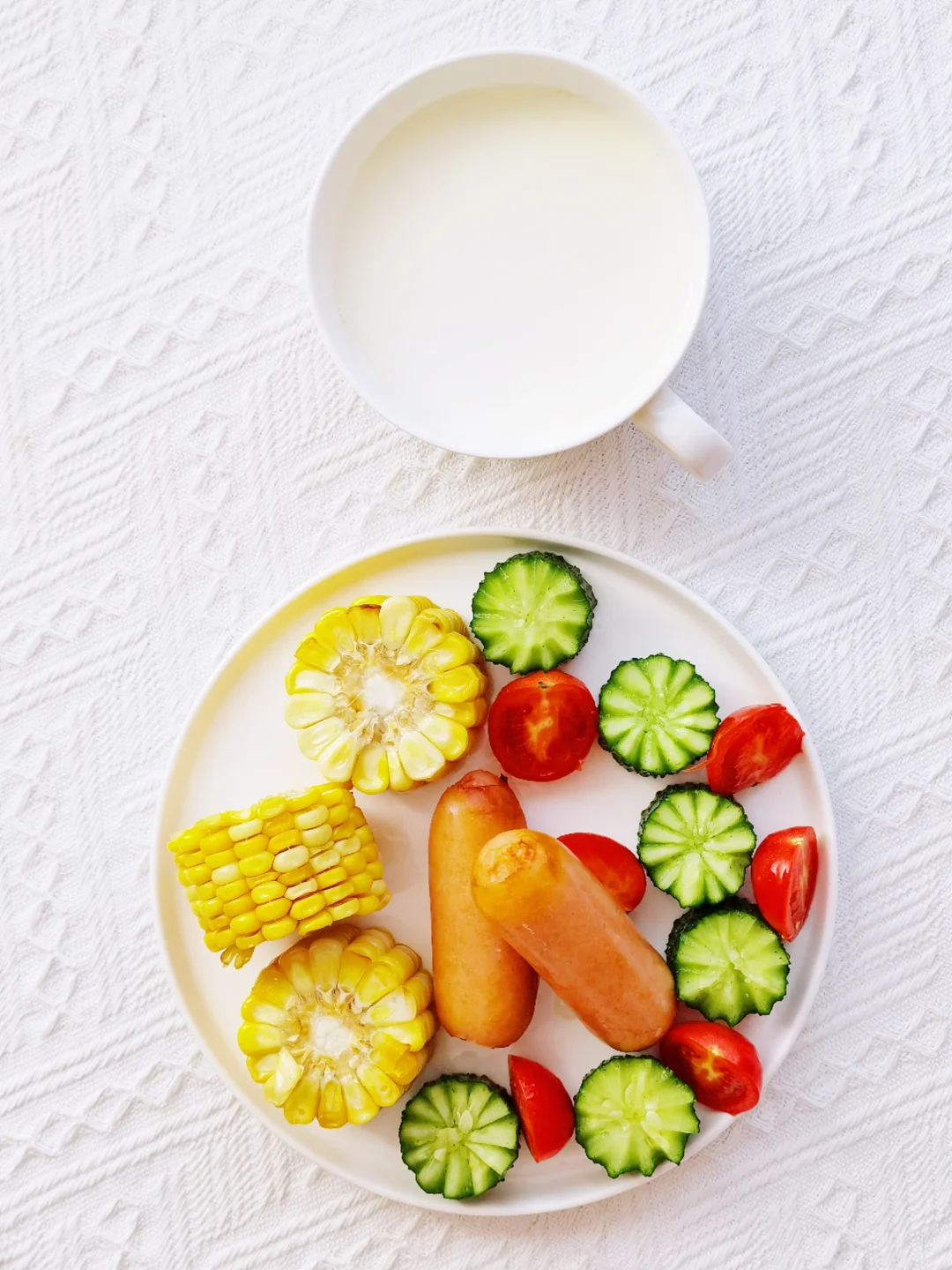 今日早餐:牛奶 空气炸锅烤玉米烤肠 黄瓜 圣女果🍱