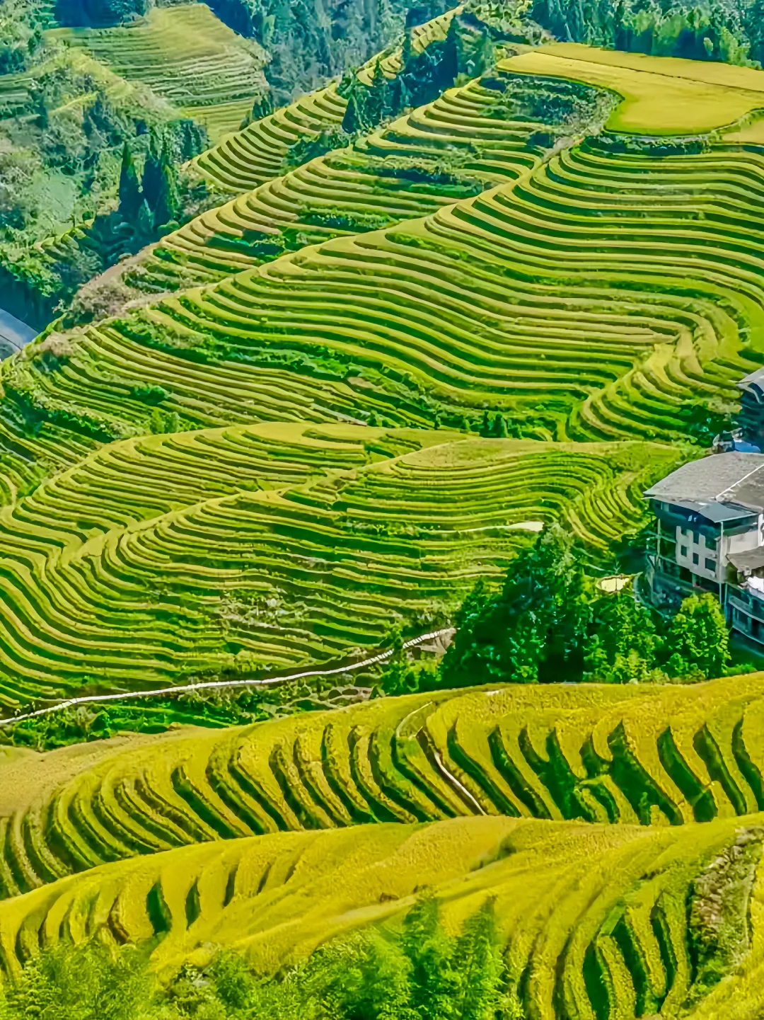 ②千层天梯:视野极佳,稻田如金黄色的瀑布倾泻而下,依山脊起伏,观赏性绝了👍
