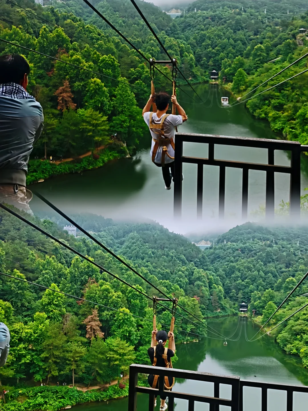 人吊在索道上从湖面上略过,速度比较快,刺激程度