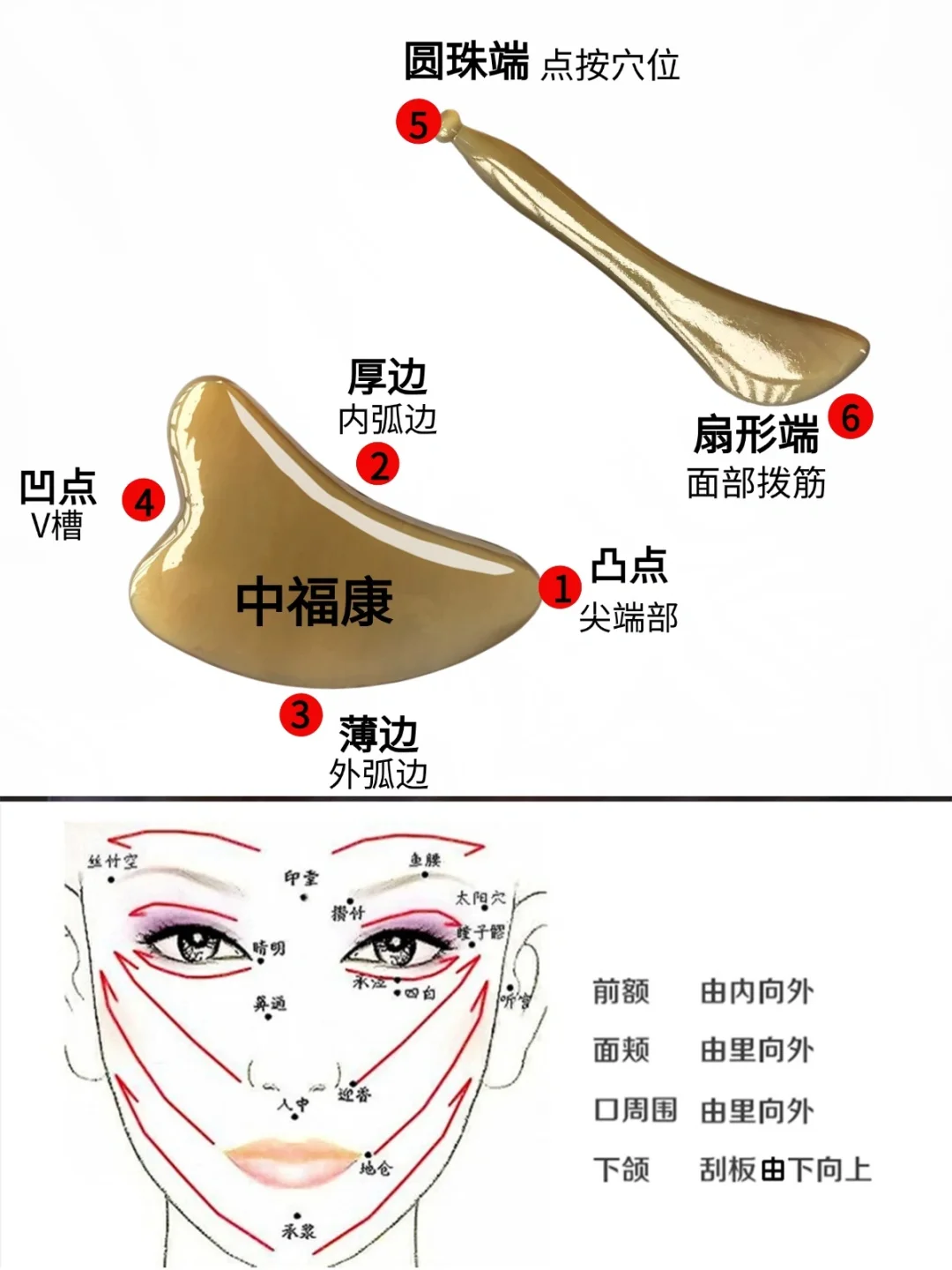 ⑥月形端,面部拨筋