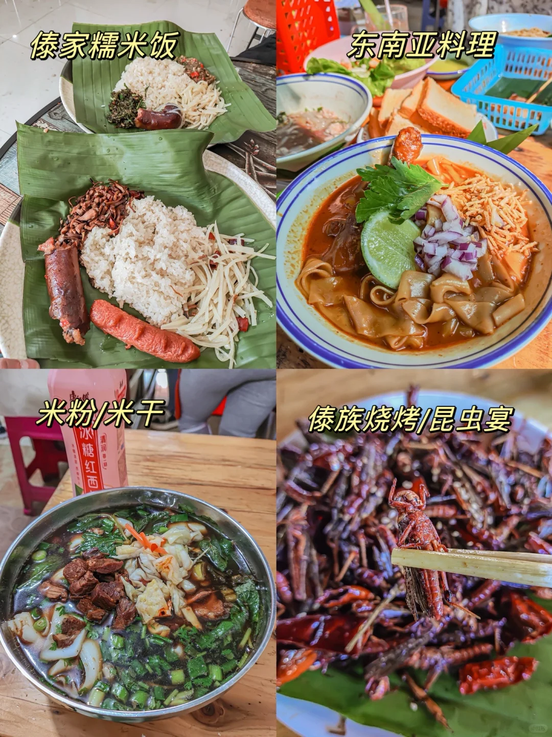 傣味烧烤、傣味火锅、舂鸡脚、糯米饭、昆虫宴🪰牛肉米干🍜等等