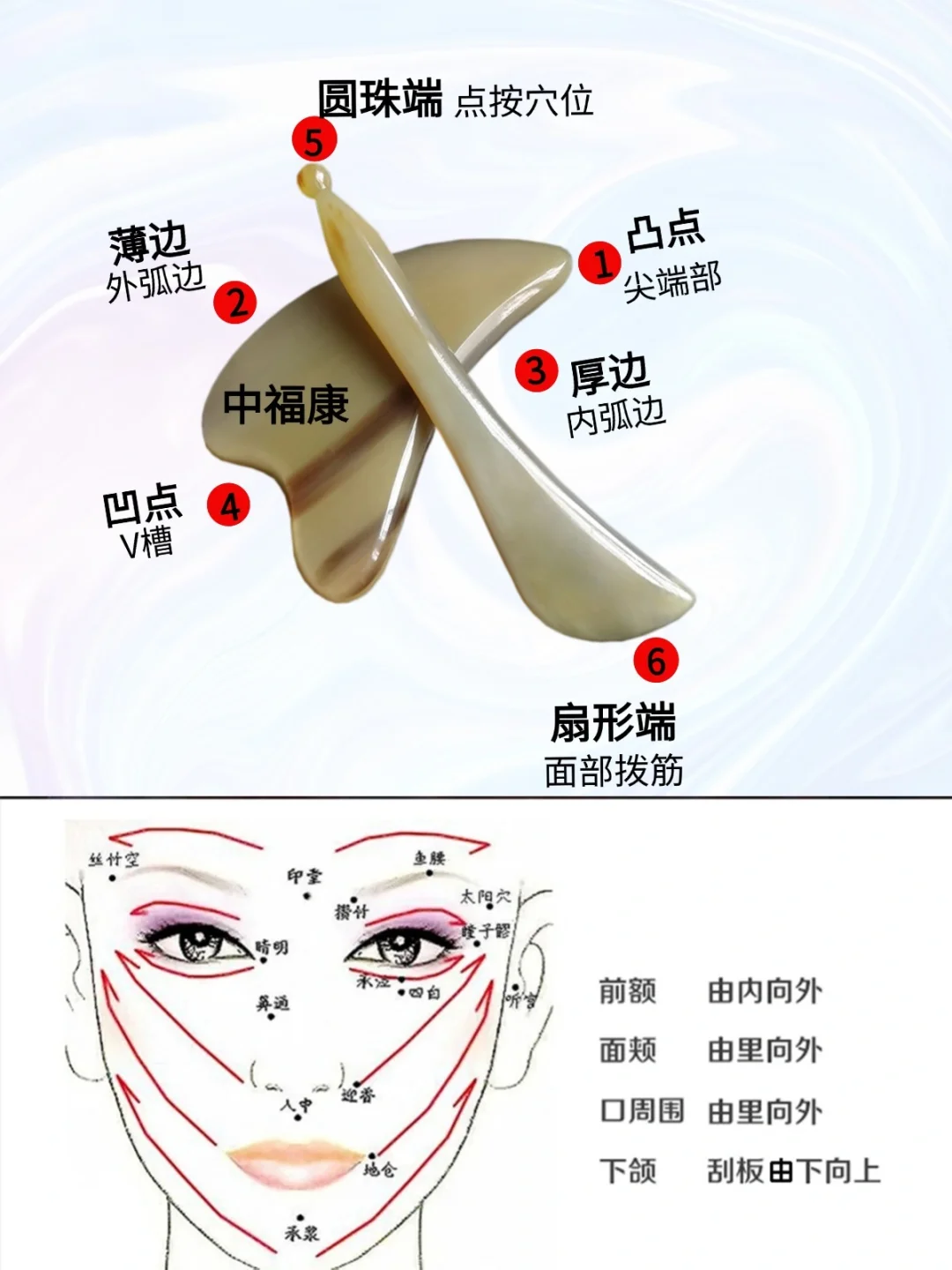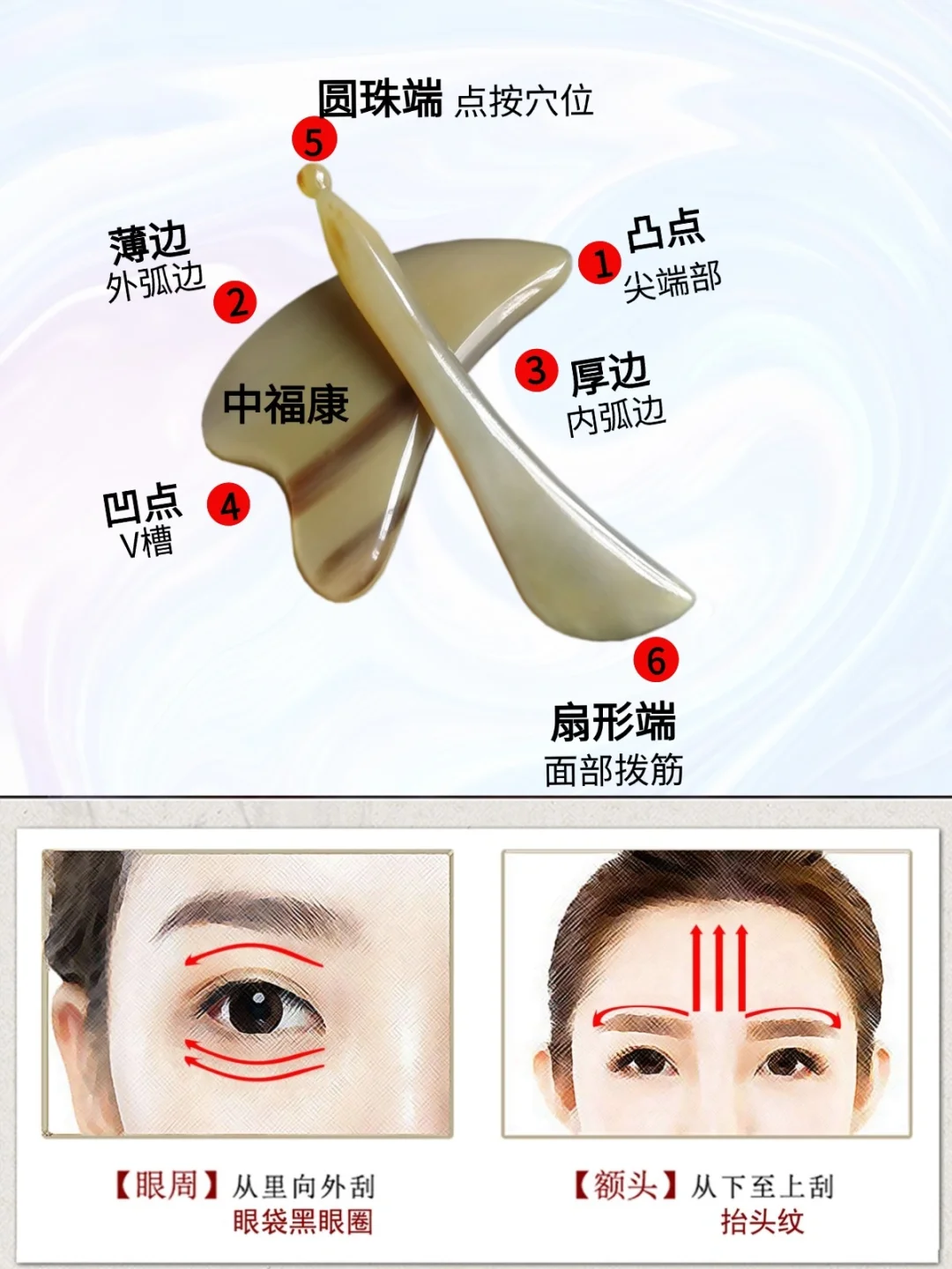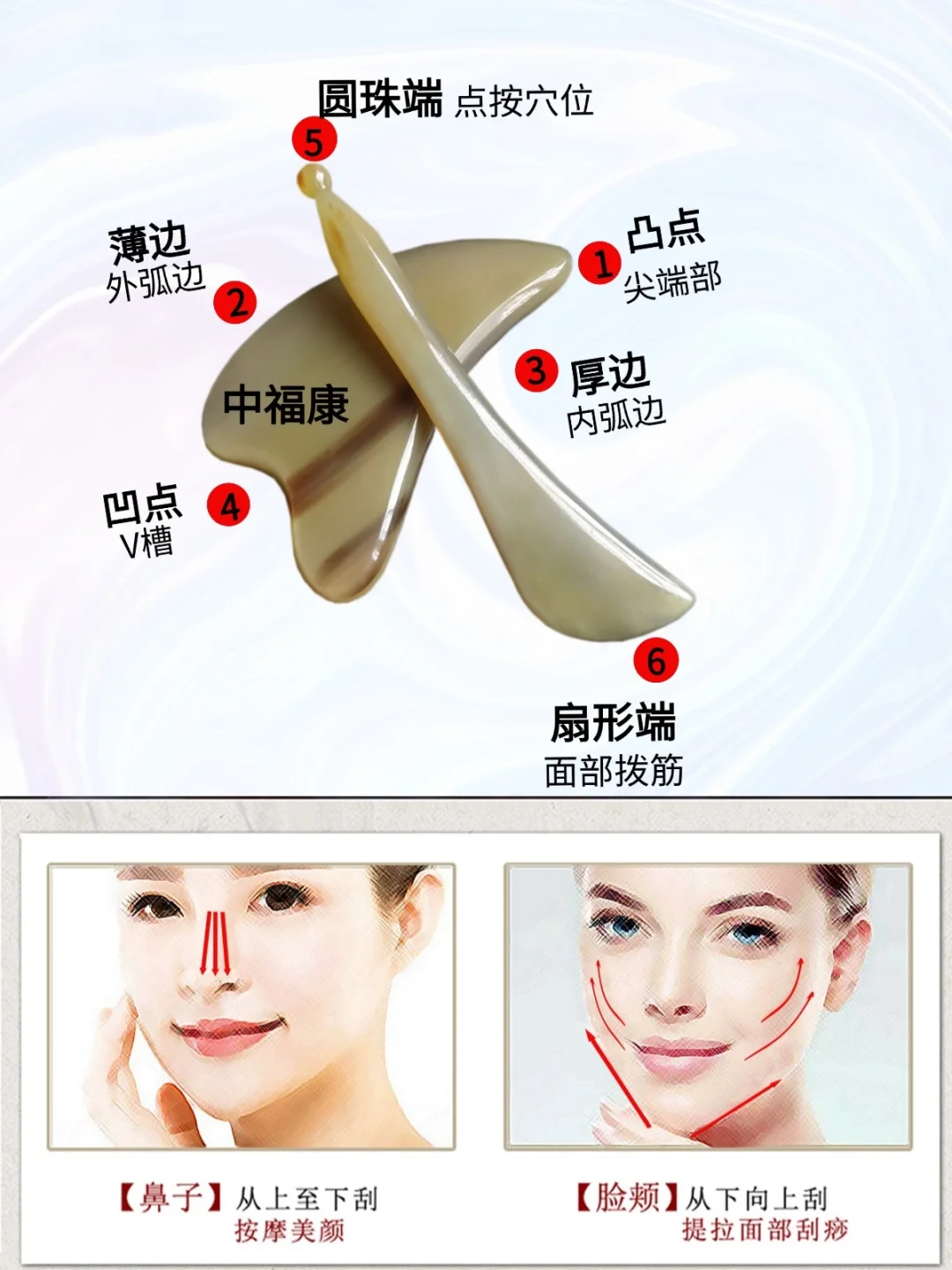 ~~~日常准备~~~ 工具:牛角刮痧板、牛角拨筋棒 搭配:润滑油、护肤品(如:水、乳、霜、精华、面膜、眼霜等;) - ~~~牛角刮痧板尺寸推荐~~~ 刮痧板的厚度:0.7-1.0cm左右 拨筋棒的长度:10-13cm左右 - ~~~面部使用步骤~~~ ①、额部部位 🔴部位:眉心至额前发际 🔴方向:由下—上,再由额中至两边发际 🔴使用刮痧板的外弧边沿 · ②、鼻部部位 🔘部位:从印堂位置至鼻尖 🔘方向:由上到下。 🔘用刮痧板的V槽部位 · ③、眼部部位 🟡部位:上下均由目内眦至目外眦 🟡方向:由内往外 🟡使用用刮痧板的尖端部位 · ④、面颊部位 🔵方向:由鼻翼至两侧太阳穴 🔵使用刮痧板内弧边/外弧边 · ⑤、嘴周围部位 🟣部位及方向:由嘴角两边至耳部正中。 🟣用刮痧板内弧边 · ⑥、下颌线部位 🟤部位方向:由下巴至耳后凹陷处(翳风穴)。 🟤用刮痧板V槽/内弧边 · ⑦、点按揉穴位 ⚪刮痧板尖端部位 - 白水牛角真假优劣鉴别与比较: 不知道怎样选,不会鉴别真假优劣。 真假根本的区别是:白水牛角密度大,会沉水,密度值在1.29-1.31克/立方厘米左右,在受热状态下会有牛角的臭味,摸上去有手感,比塑料要重一些,而且一般会有血色和纹路;而假牛角则没有以上特征。 质量优劣,主要从原材料,做工,厚度,光泽度以及加工精度区别。