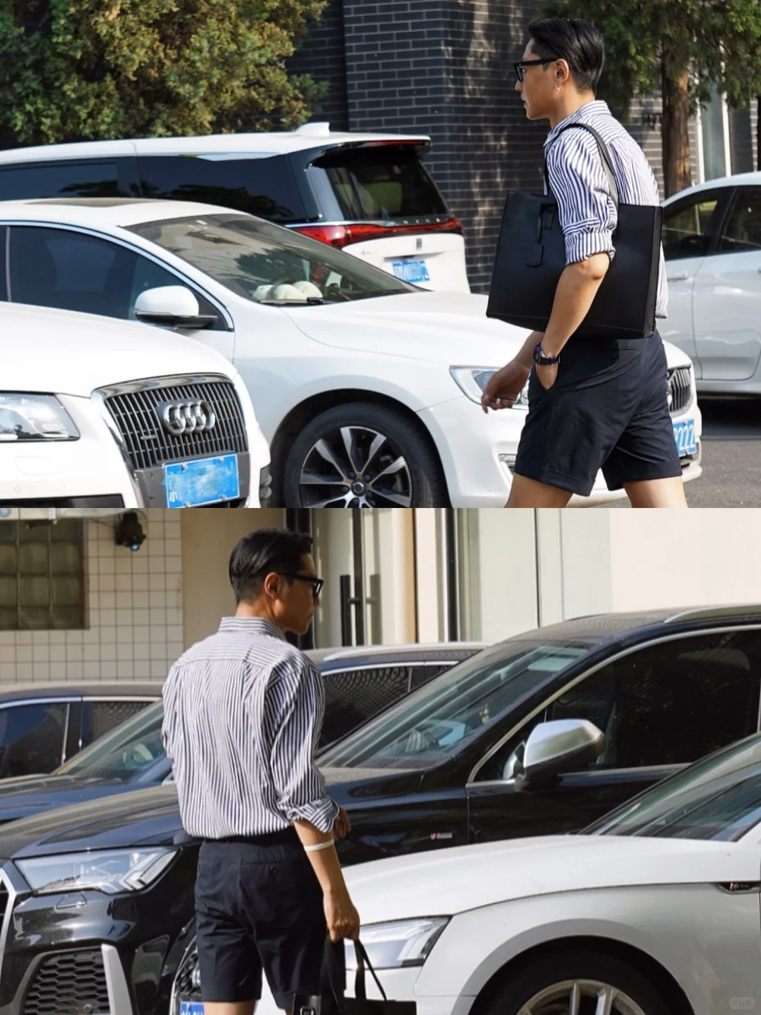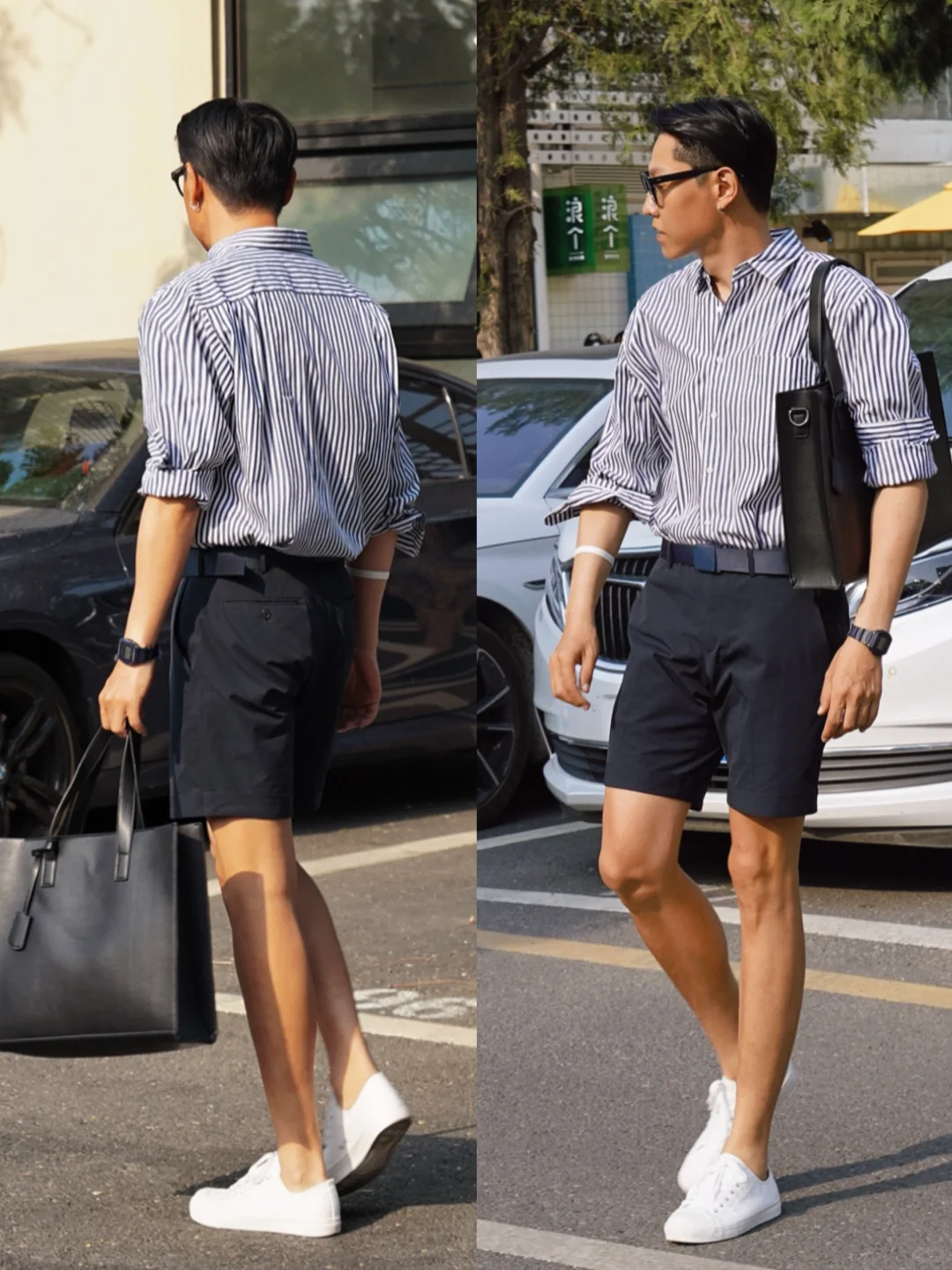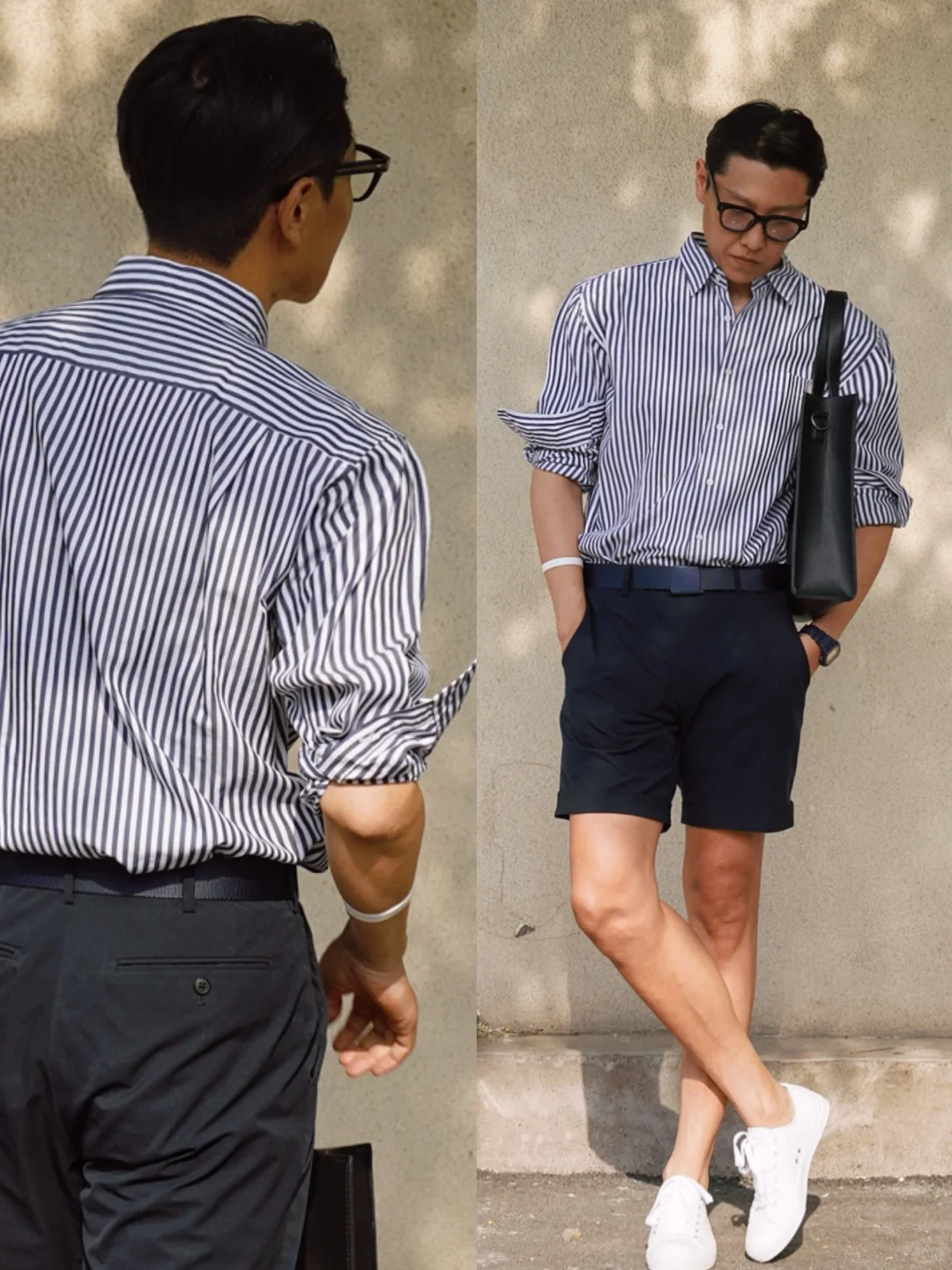 日常|舒适|通勤 👆🏽今天主打藏蓝色|用一杯冰美式☕️奖励一下一天的忙碌!蓝白条纹衬衫搭配藏蓝短裤,尊重一下工作日,当然也少不了穿上叔叔最爱的小白鞋。下班快乐!