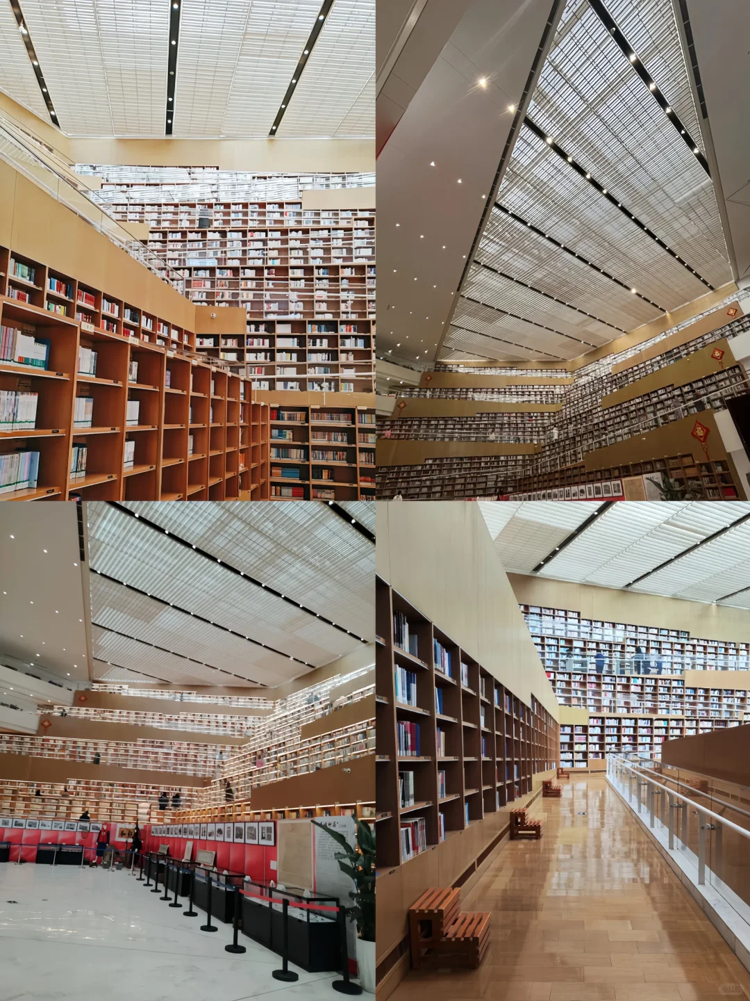 图书馆的设计灵感源自云冈石窟,大厅挑高令人震撼,丰富置身于书籍的高峰⛰,被沿着坡道布设的藏书所环绕