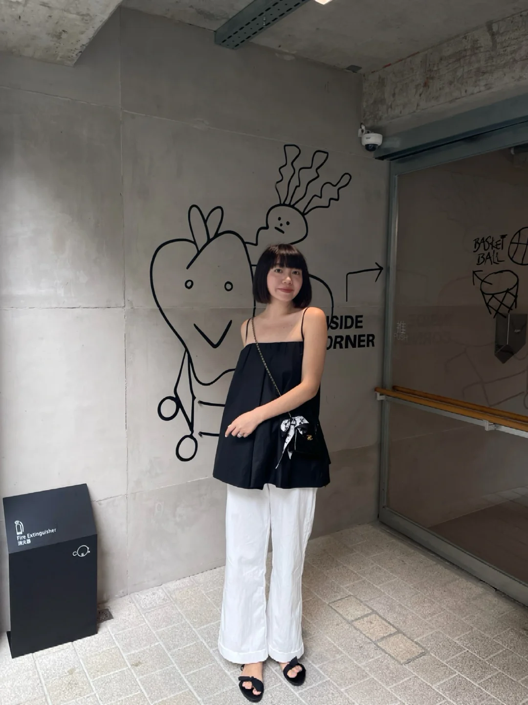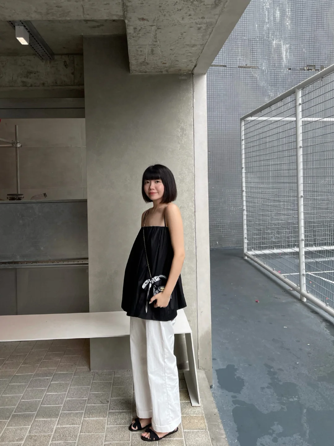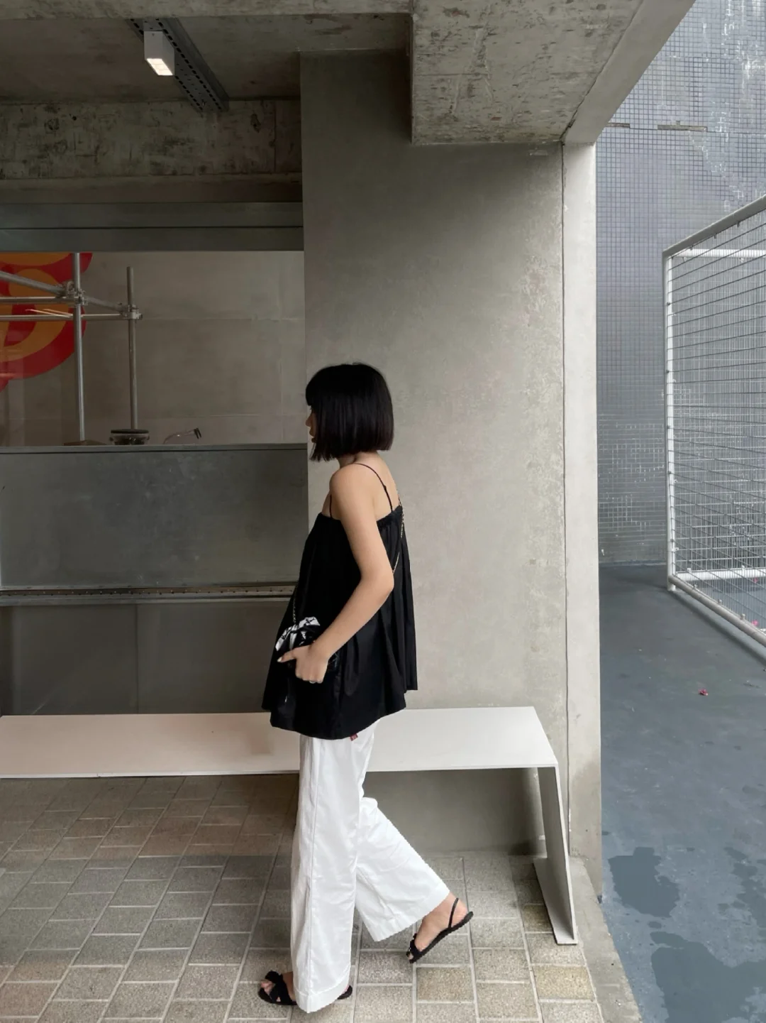 少女清新穿搭,黄色吊带裙搭配米色长裤,轻松惬意。
