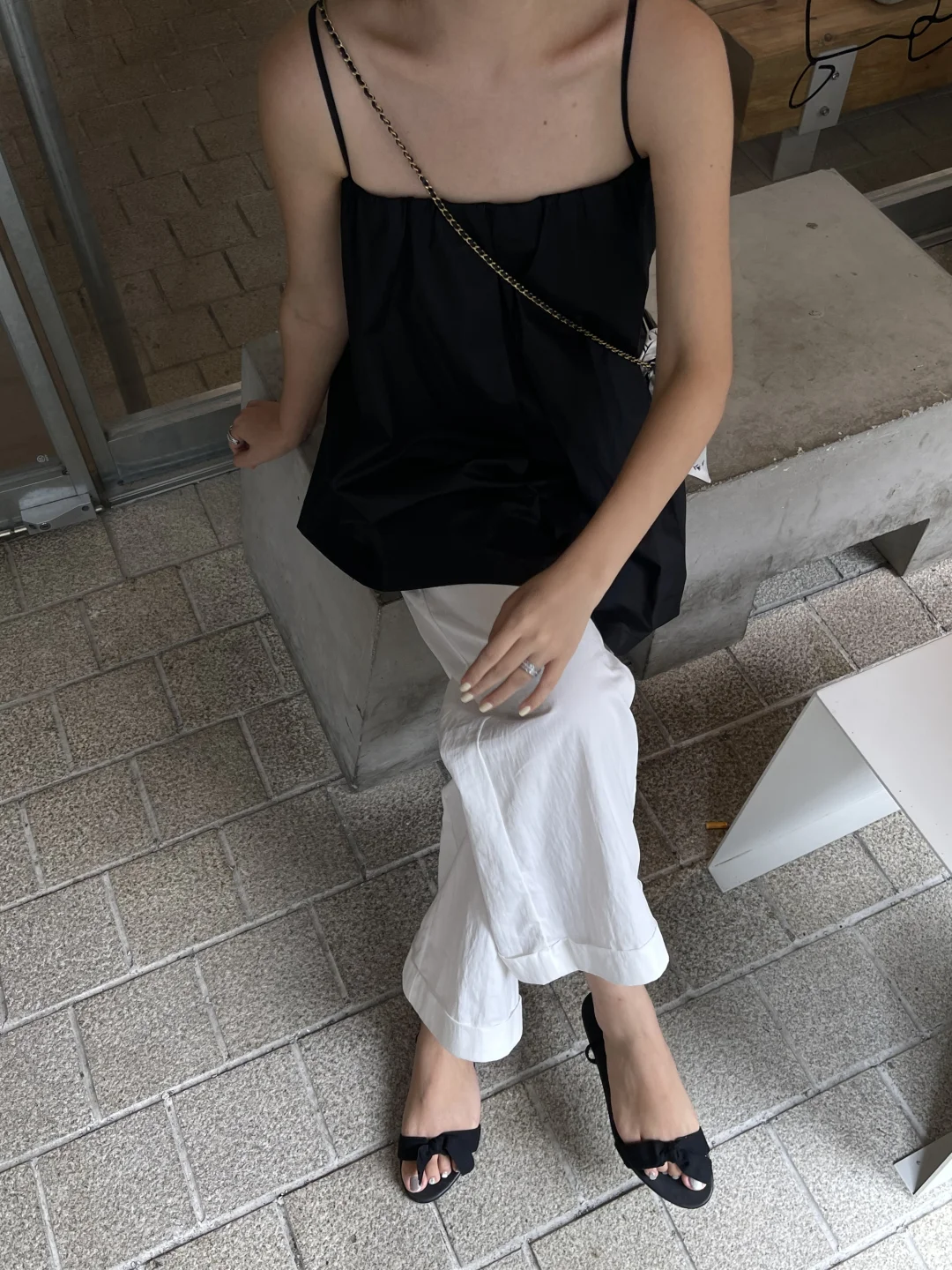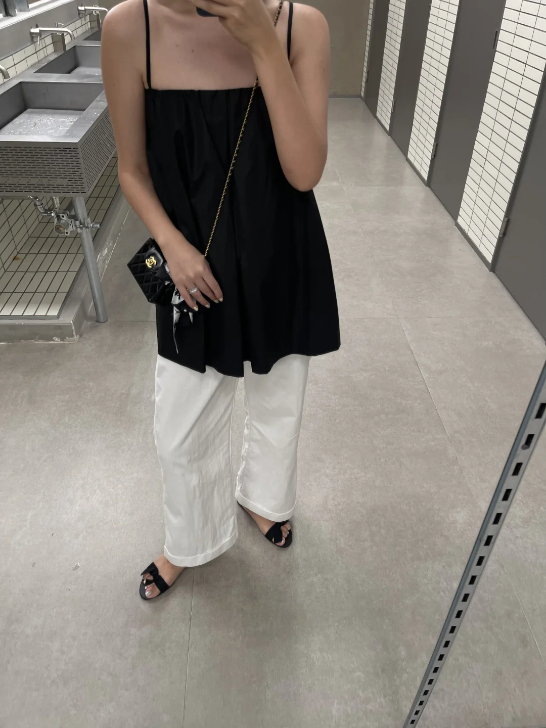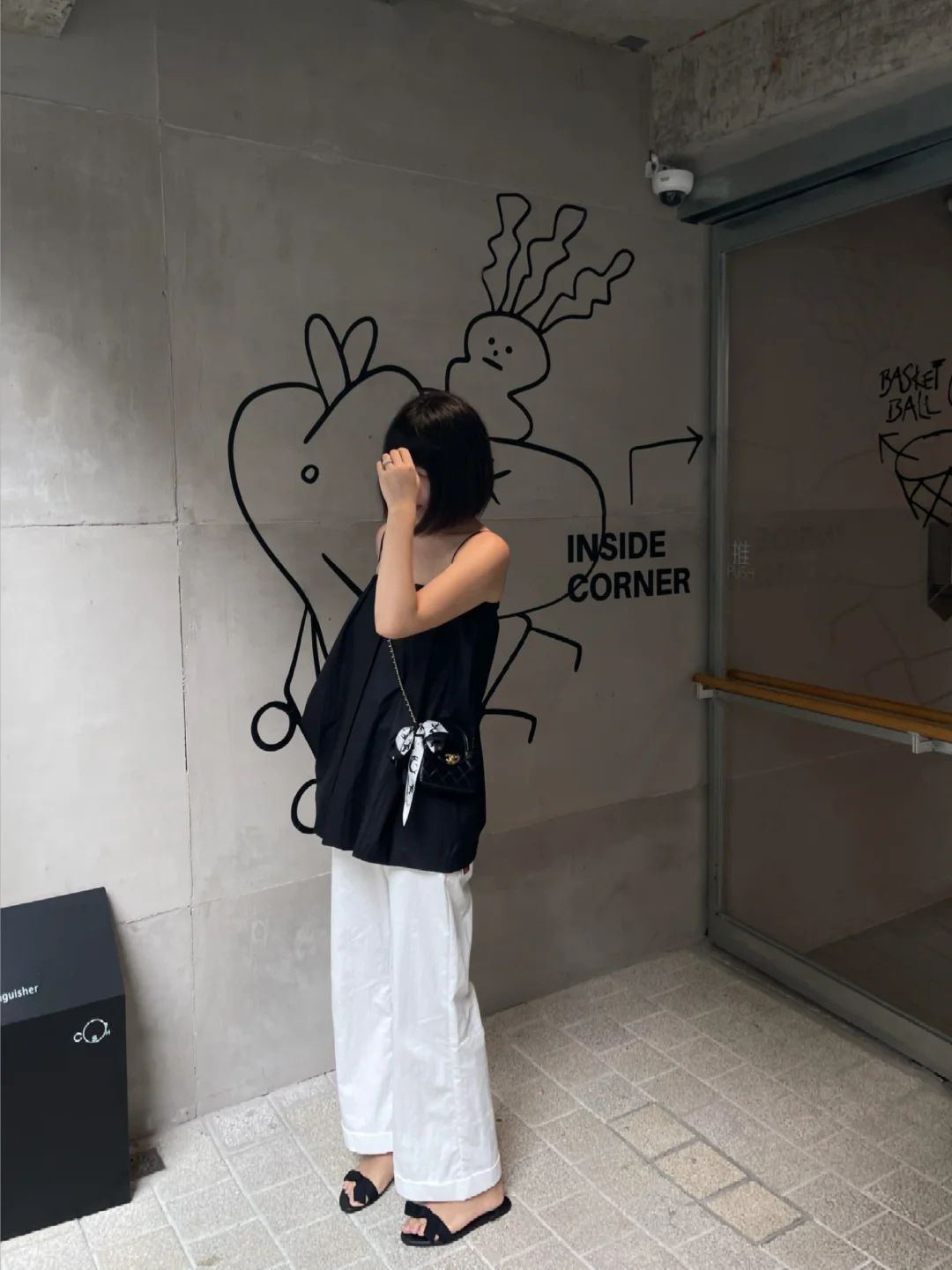 少女清新穿搭,黄色吊带裙搭配米色长裤,轻松惬意。