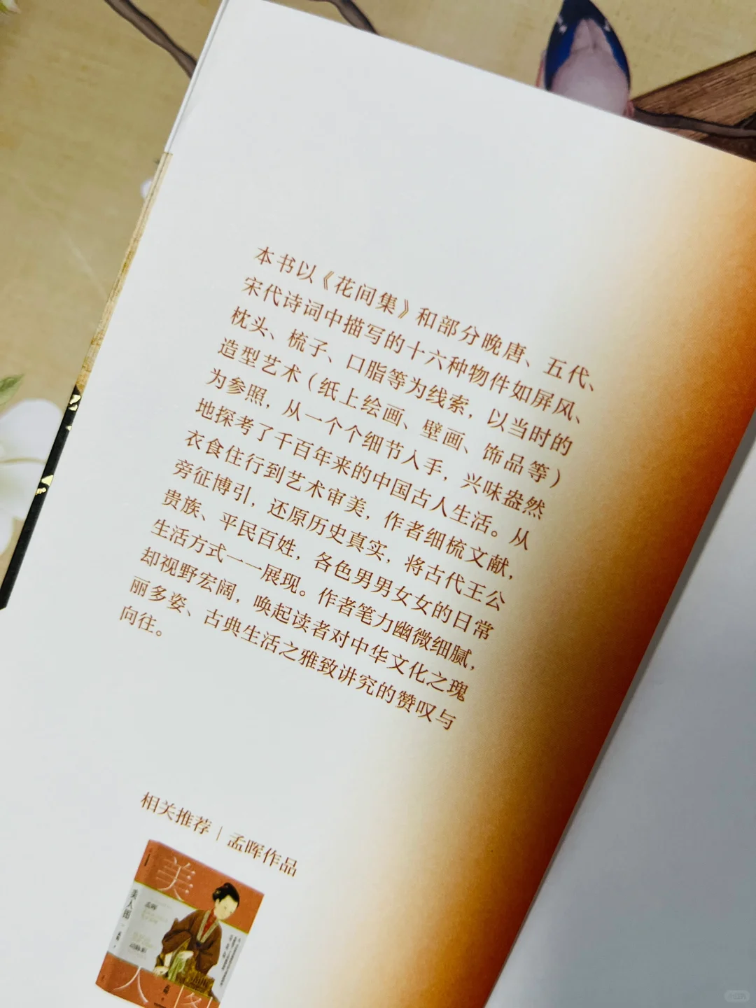 本书以《花间集》和部分晚唐、五代、宋代诗词中描写的十六种物件为底本,通过绘画、壁画、饰品等造型艺术,从一个个细节入手,旁征博引,细致考据,层层推敲,从床上屏风到山枕题词,从添香到熏衣,从口脂到黛眉……将这些物件的真实模样以图文的方式呈现出来。读者可以根据书中的彩色高清图片,感受到书中描写的各个器物的细节之美。