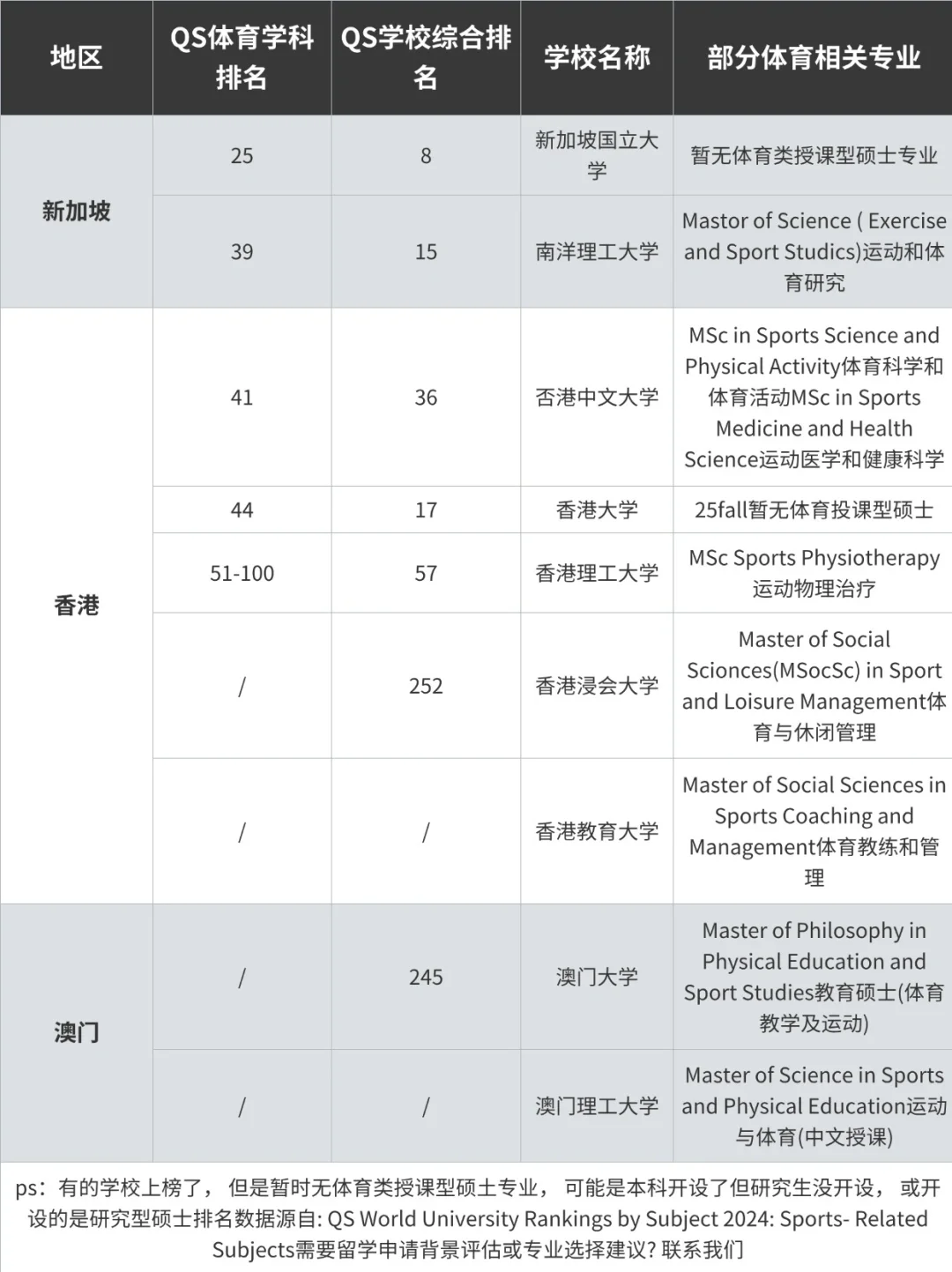 1️⃣ 香港中文大学:QS 体育相关学科排名第 41,QS 综合排名 36。相关专业有运动医学和健康科学、体育科学和体育活动等。