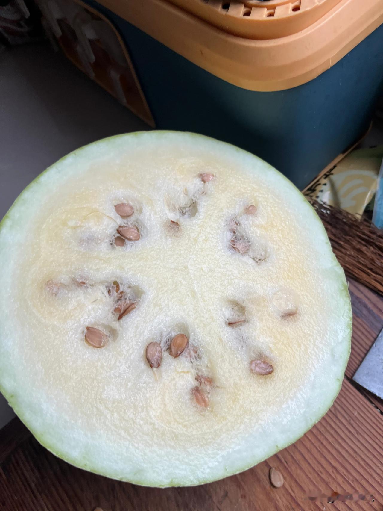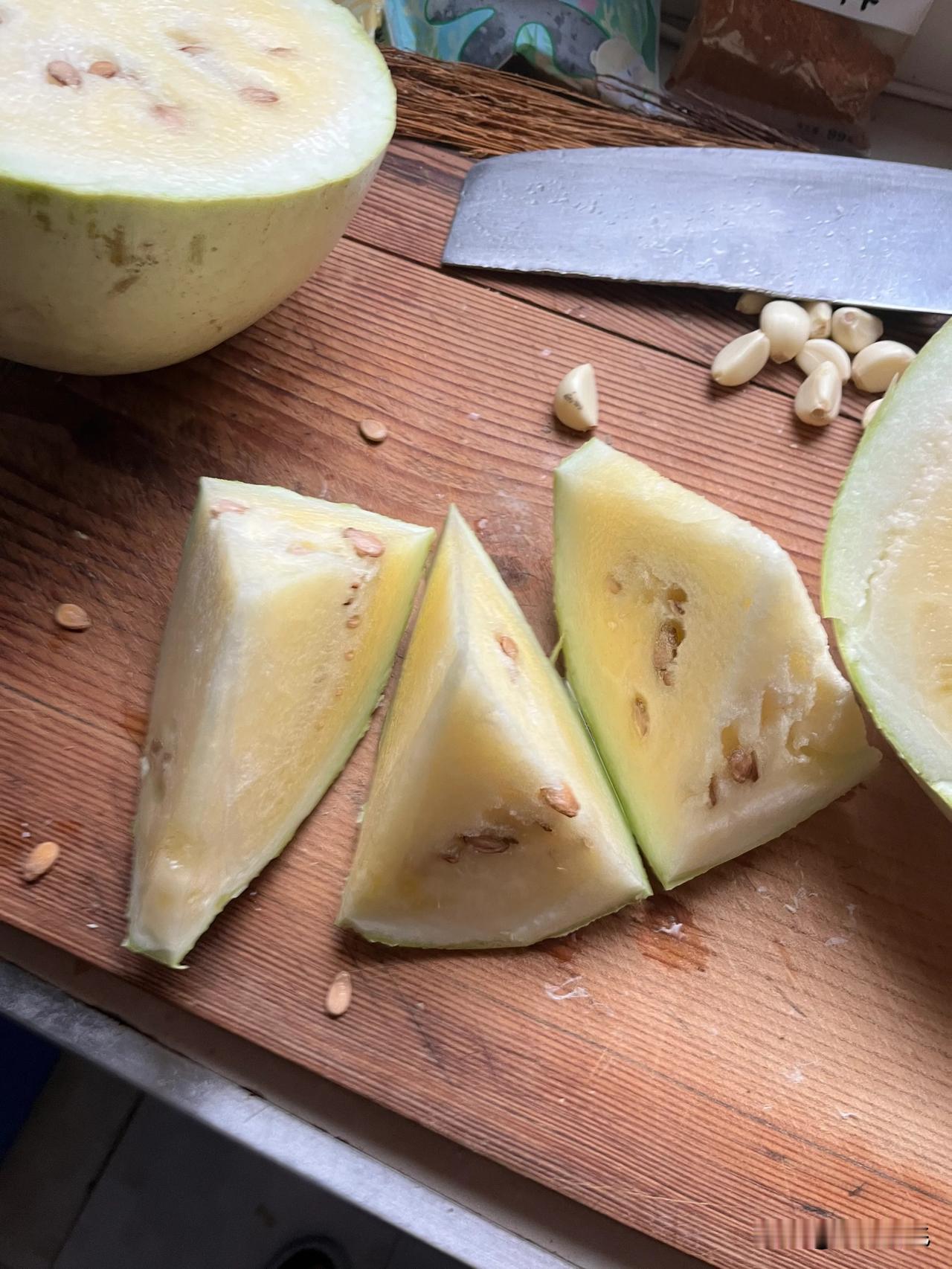大家知道这是什么水果吗? 我前几天出差去万荣到南张乡时候初次见到这种瓜,由于是在车上看到了,也就是“骑马观碑”以为是冬瓜,但是老感觉不是很像。就又走了一段发展买这种瓜的越来越多,牌子上写着三白瓜,就很好奇的下车去问问这个到底是蔬菜还是水果,到底是什么东西。 老板说这是他们这个地方的特产,这种皮白肉白籽子白的就是三白瓜,皮白肉白籽子红的叫雪里红。味道差不多,就是三白瓜比雪里红要大一些。出于好奇我就买一个尝一下,老板说说这个瓜不甜的,就是瓤沙、水多。你先买个小一点的尝一下,觉得好吃了再买大的。外地人一般以为这是西瓜没有长熟呢。 到了目的地把瓜切开,吃着很美味的。就再回来的路上多买了几个,给三门峡的朋友也尝一下。