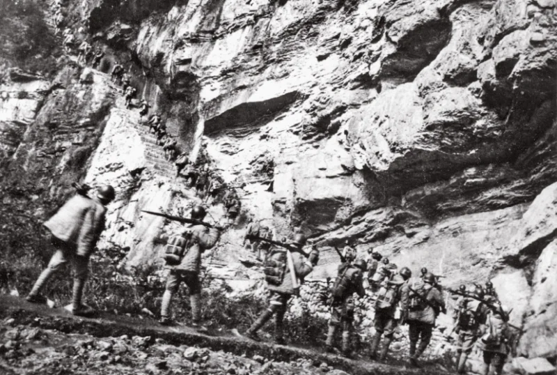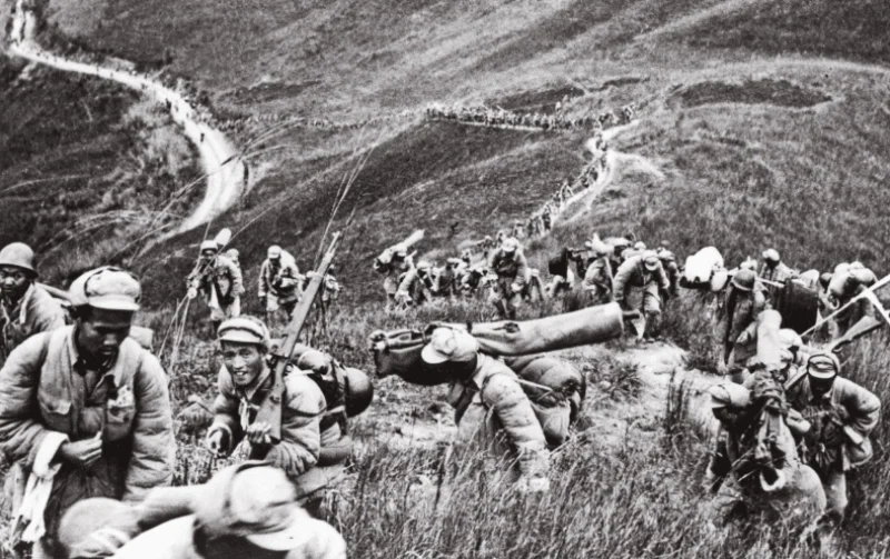 图7:解放大西南战役中,解放军官兵正翻过黔西地区高山前进。1950年3月,西南军区发起西昌战役,国民党军残部一触即溃,27日西昌解放,胡宗南与贺国光乘飞机逃离。4月13日最后一支国民党残军被全歼,除西藏外,中国大陆已全部获得解放